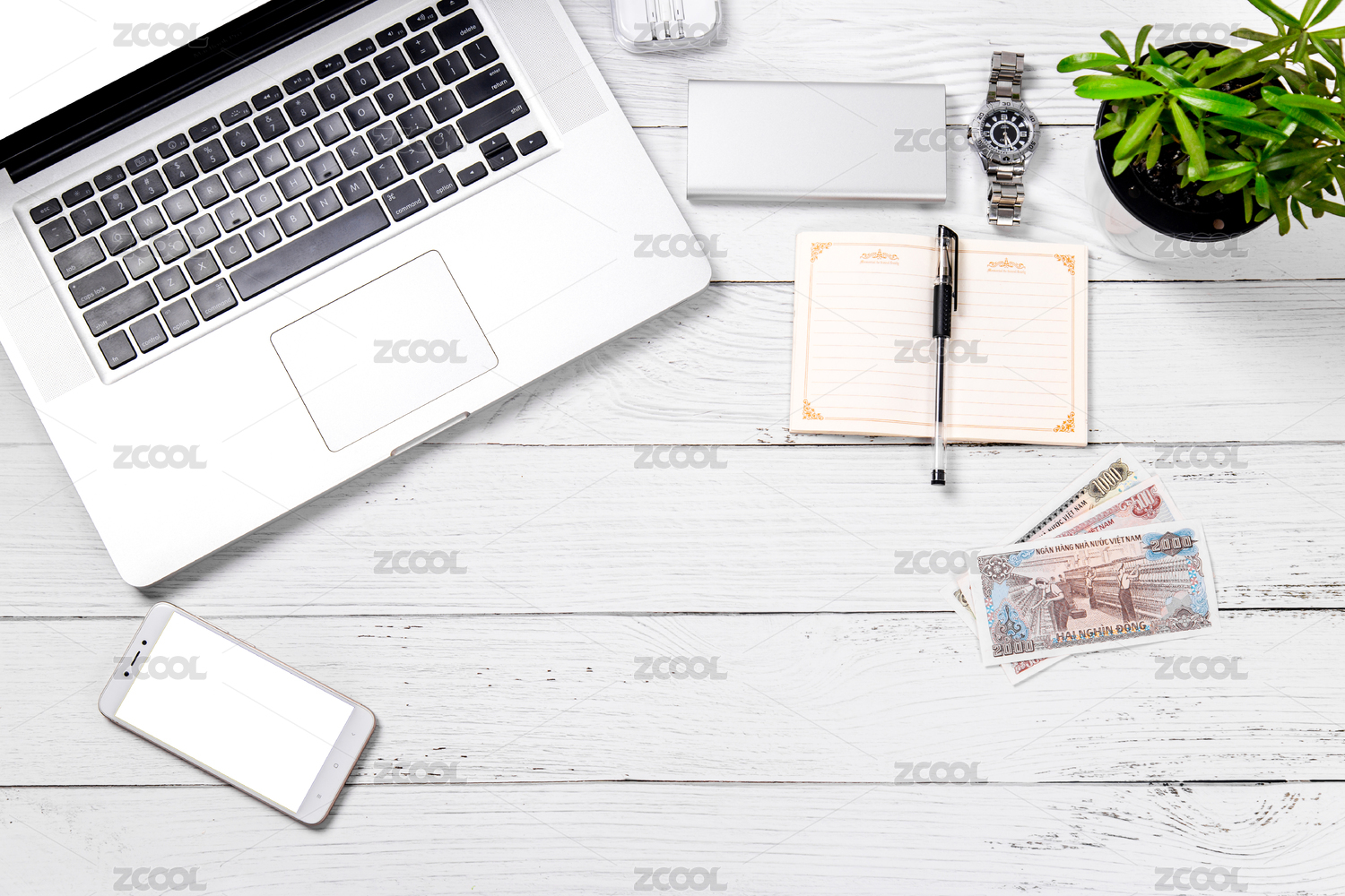 木纹桌面、笔记本,飞机模型,智能手机,指