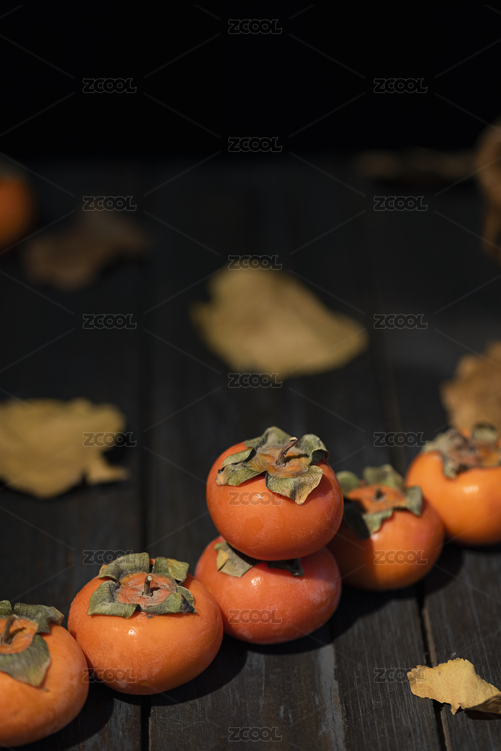 暗色桌子上的柿子与落叶