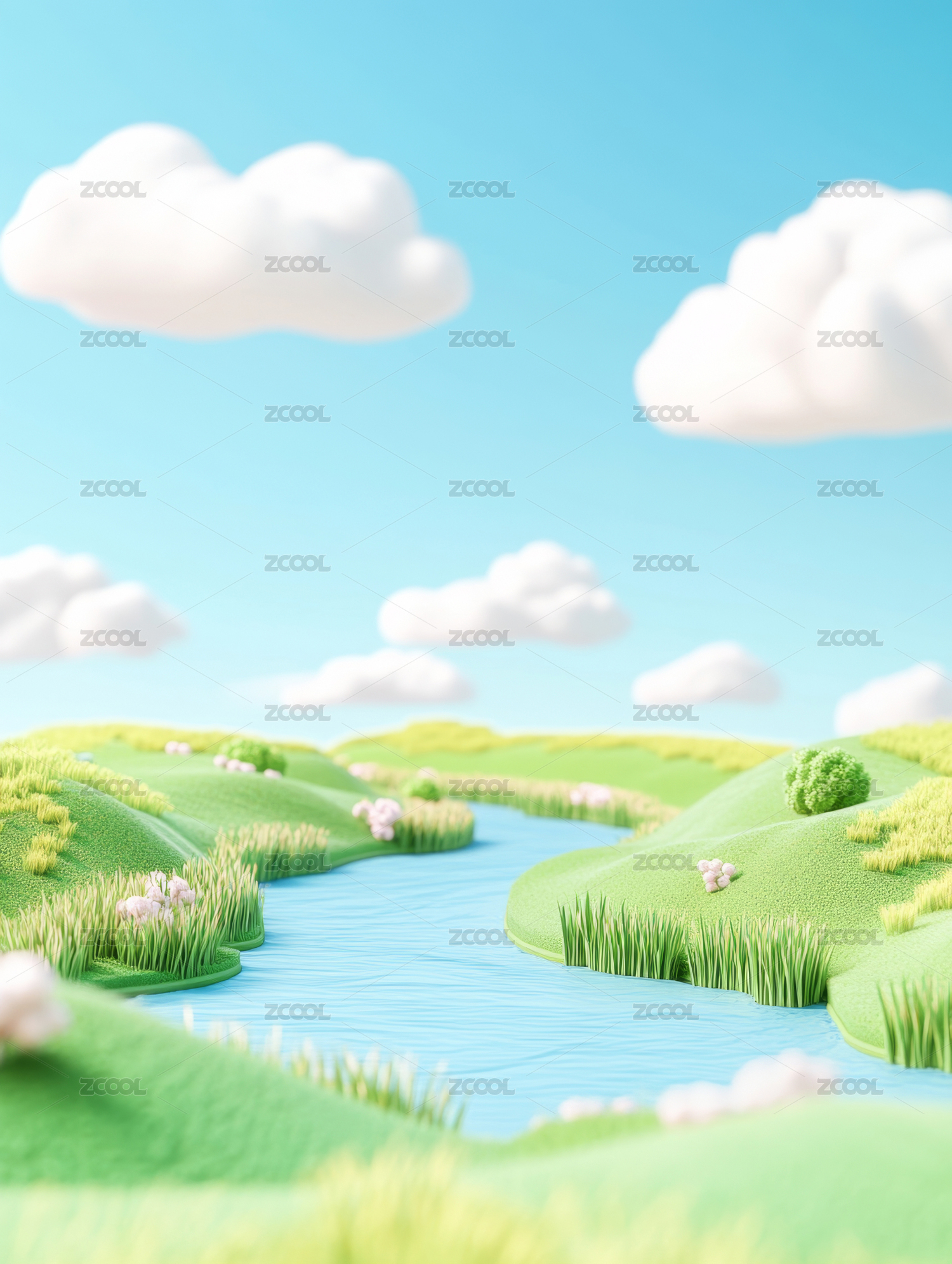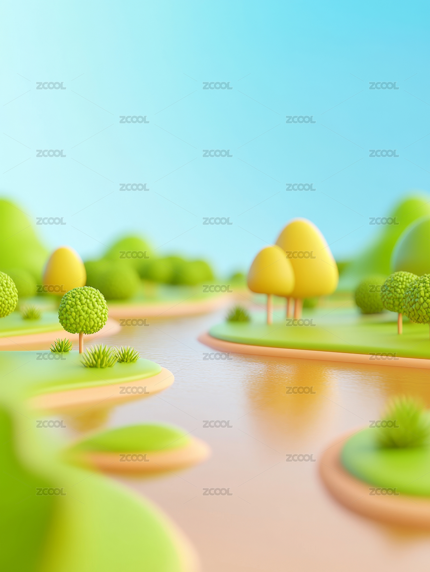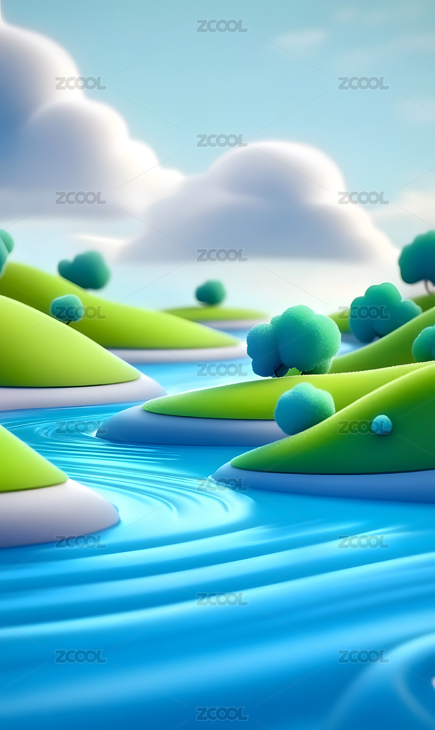 卡通,自然,景观,树木,云朵,草地,水池,天空,平台
