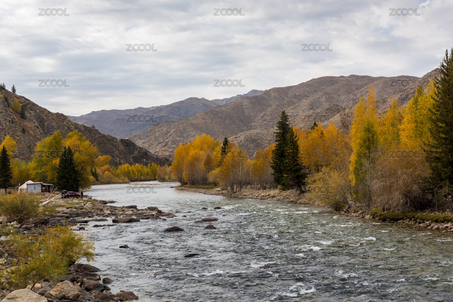 中国新疆额尔齐斯大峡谷河流树林秋色
