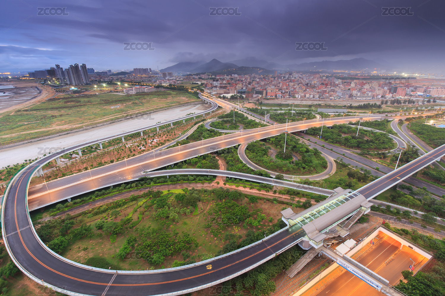 中国广东省珠海市金湾立交桥城市风光日落夜景