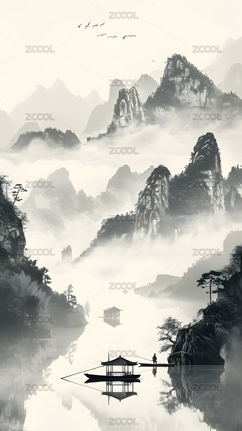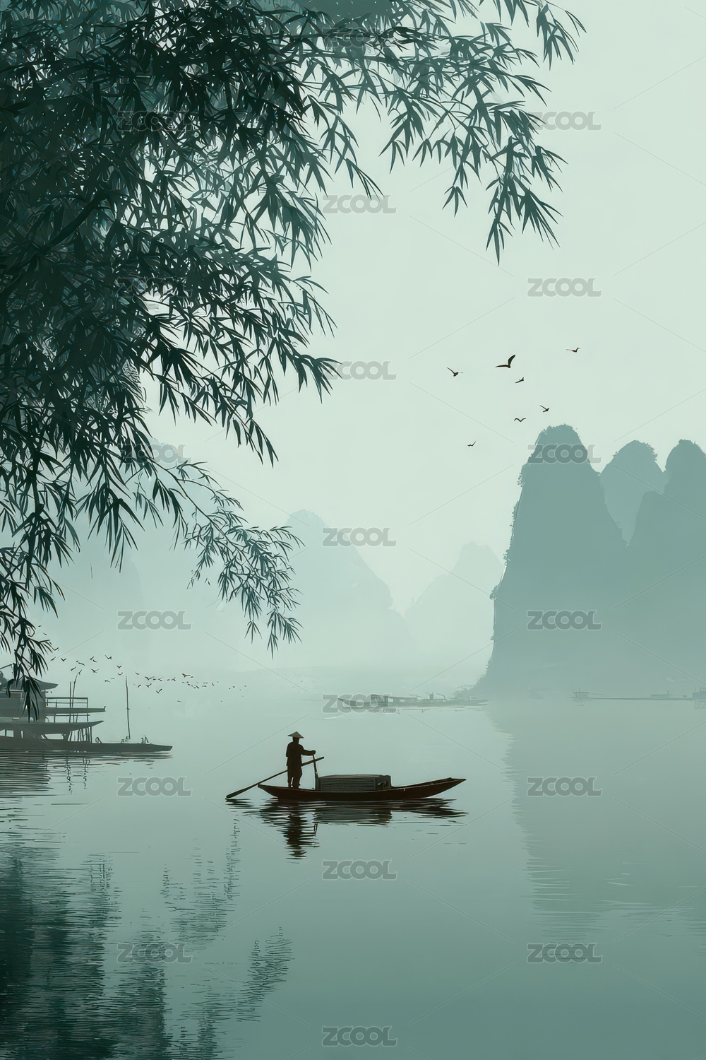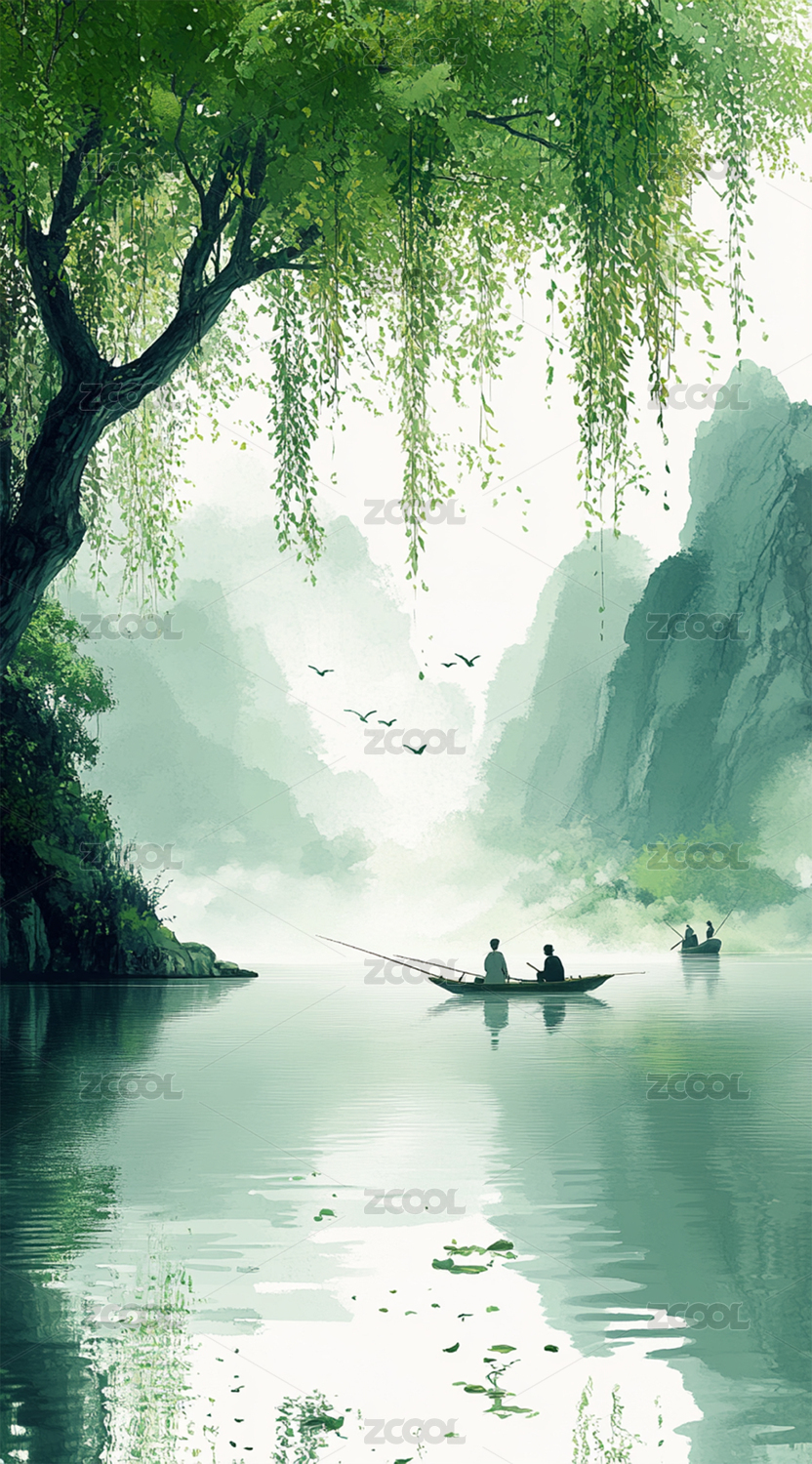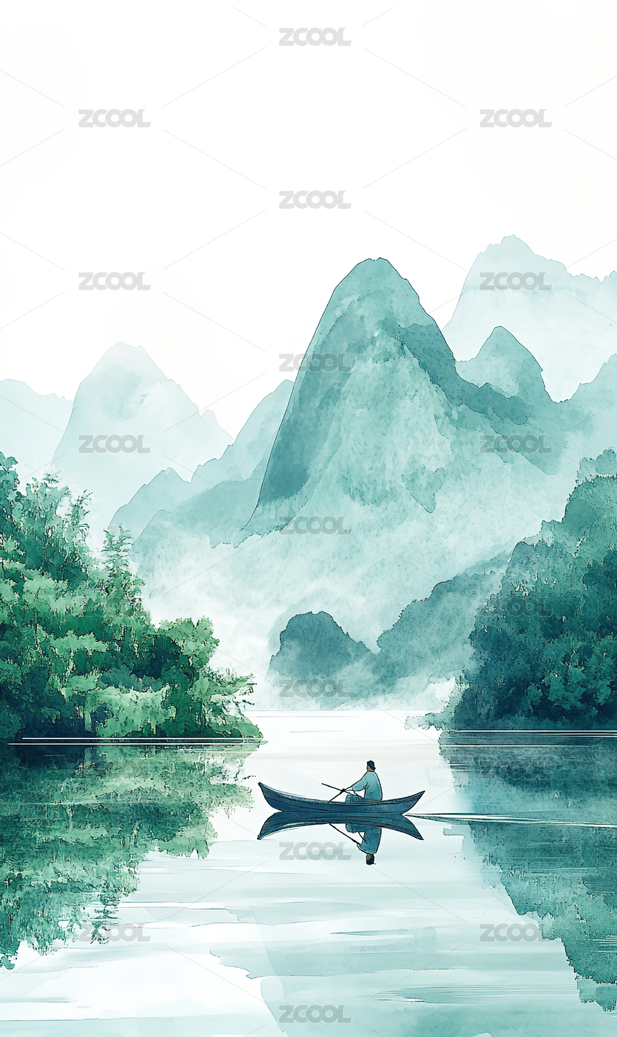 倒影, 宁静, 静谧, 山峰, 湖泊, 祥和, 水彩画,峡谷, 小舟, 绿树