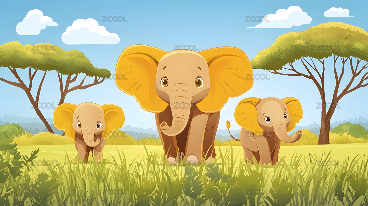 阳光灿烂大草原上嬉戏卡通大象