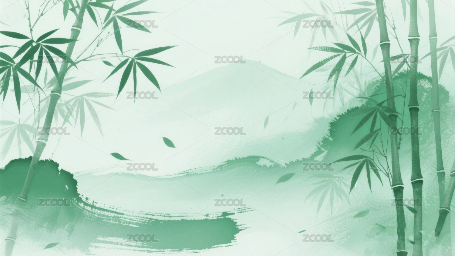 春天 近处青青草地与飘扬柳枝远处青山朦胧