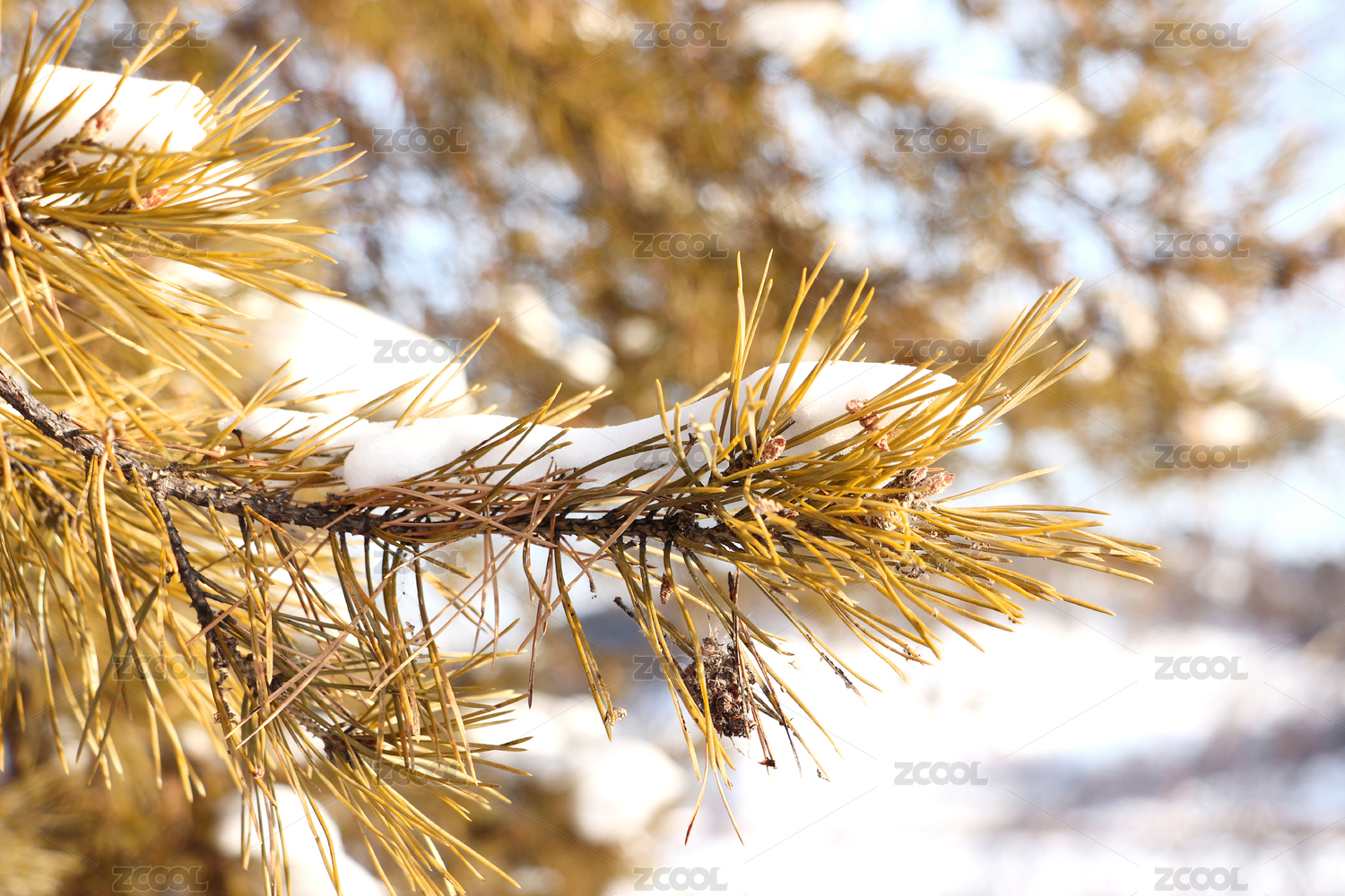 金黄色松枝上的皑皑白雪特写风光