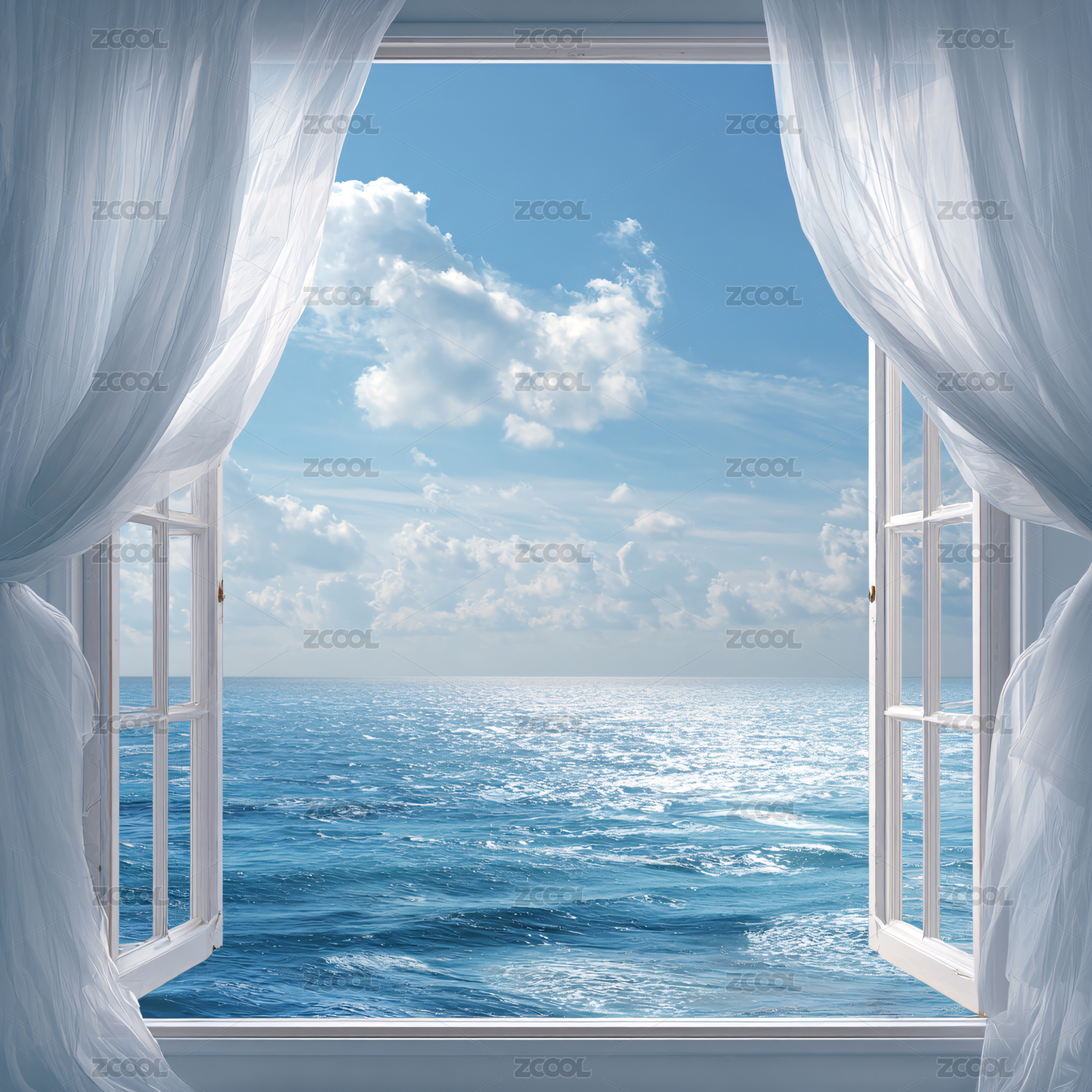 海景,窗景,地中海,阳光,鲜花,花盆,海岸线,蓝天,白云,春天