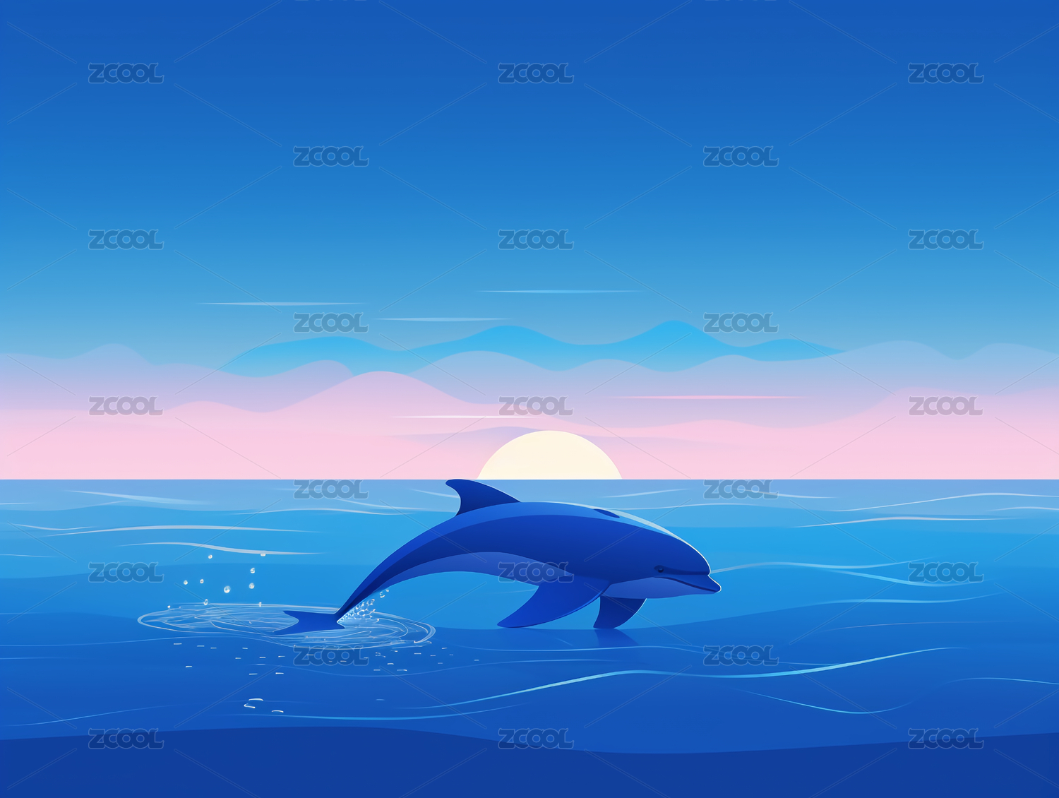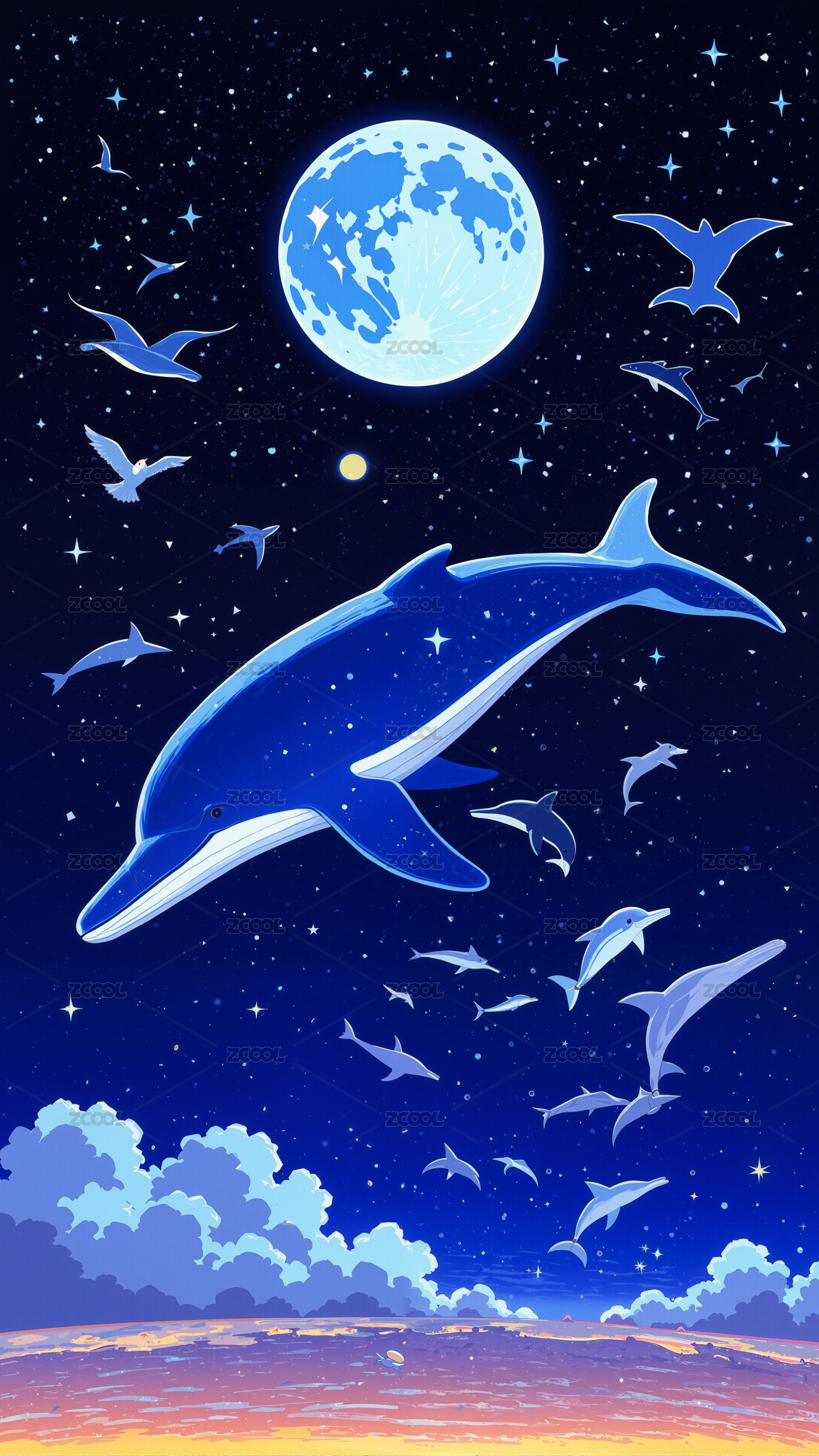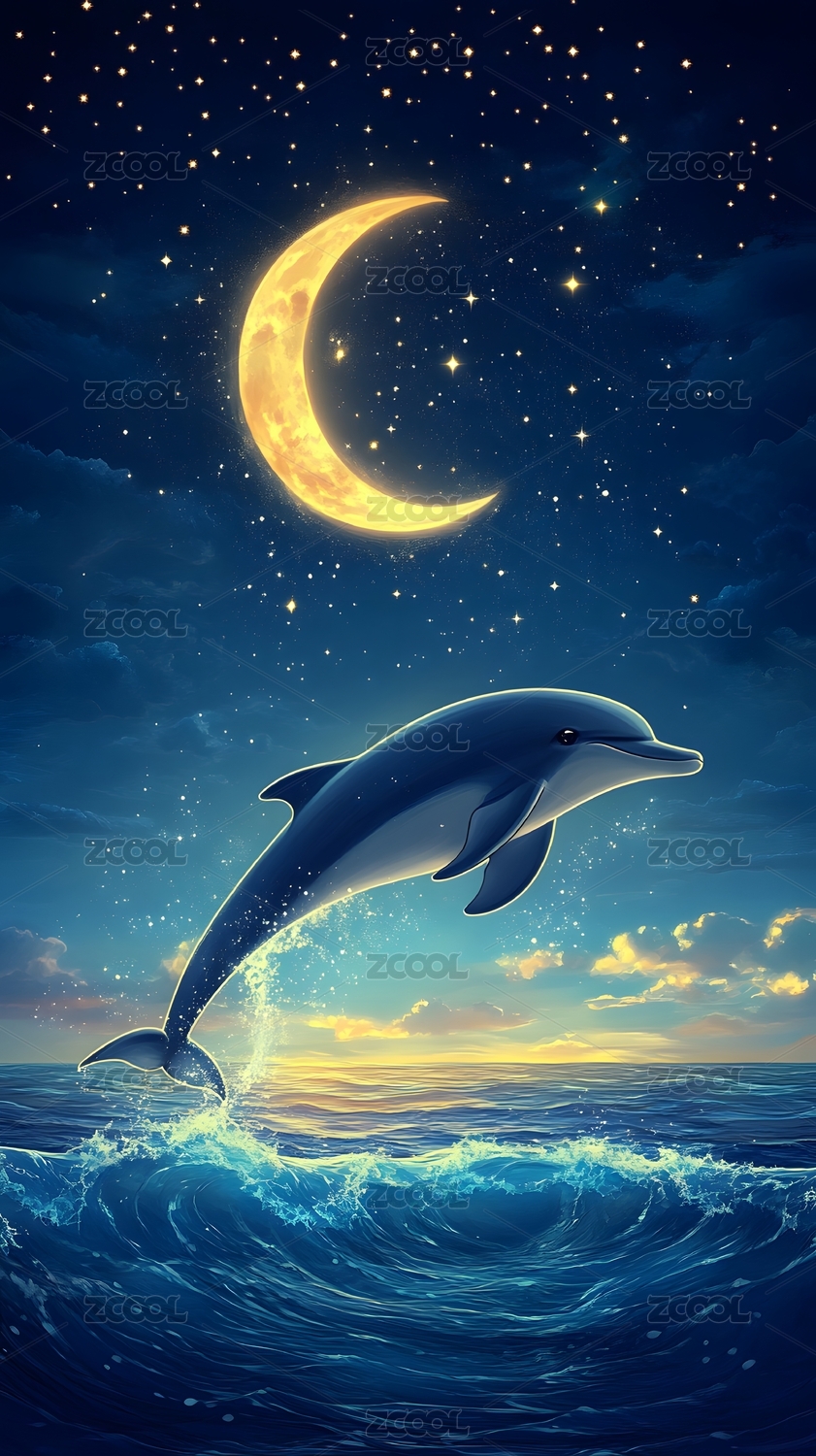 蓝色,海豚,月亮,海洋,云彩,海滩,跃出,水面