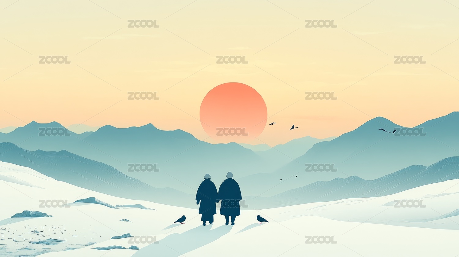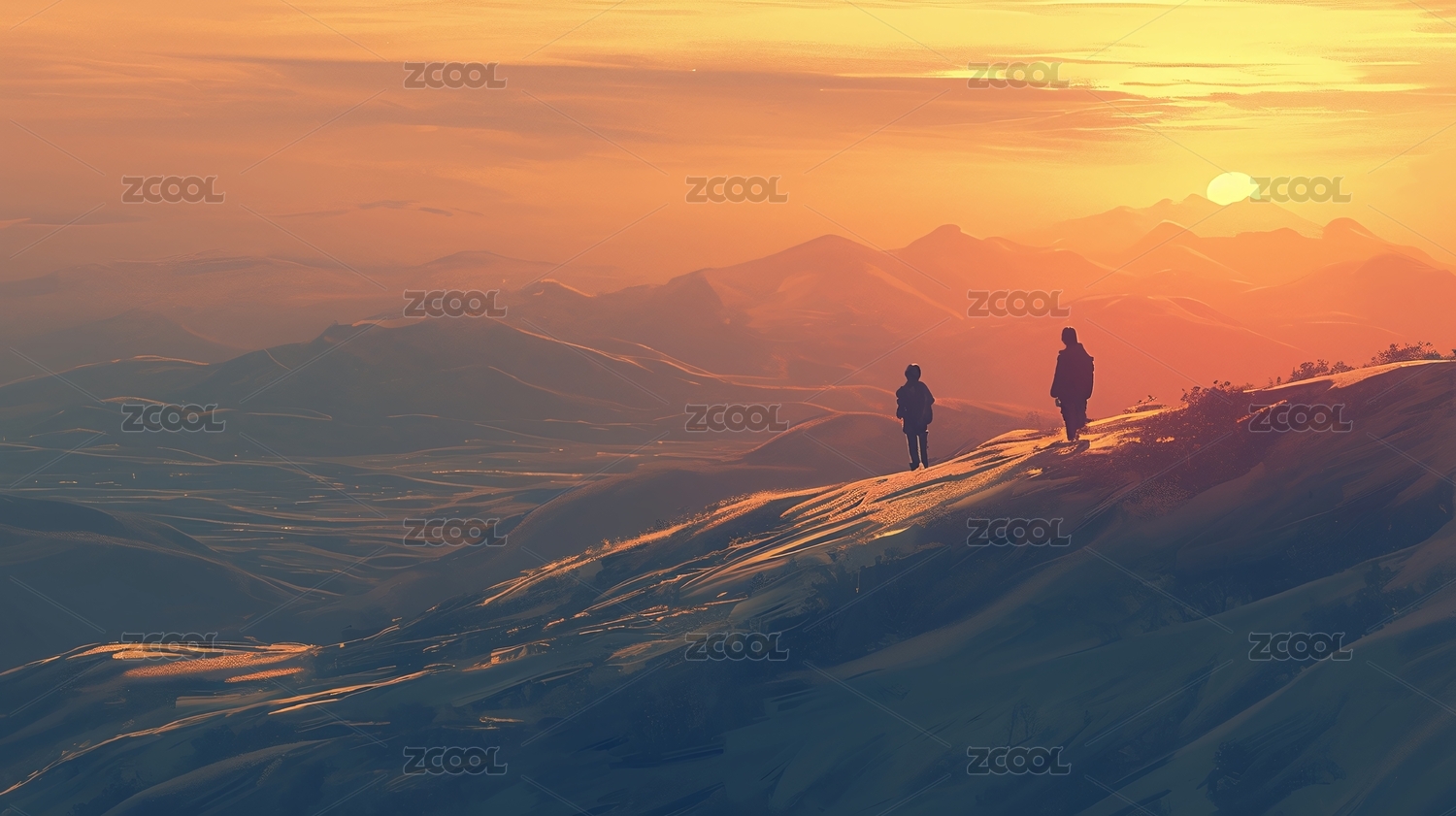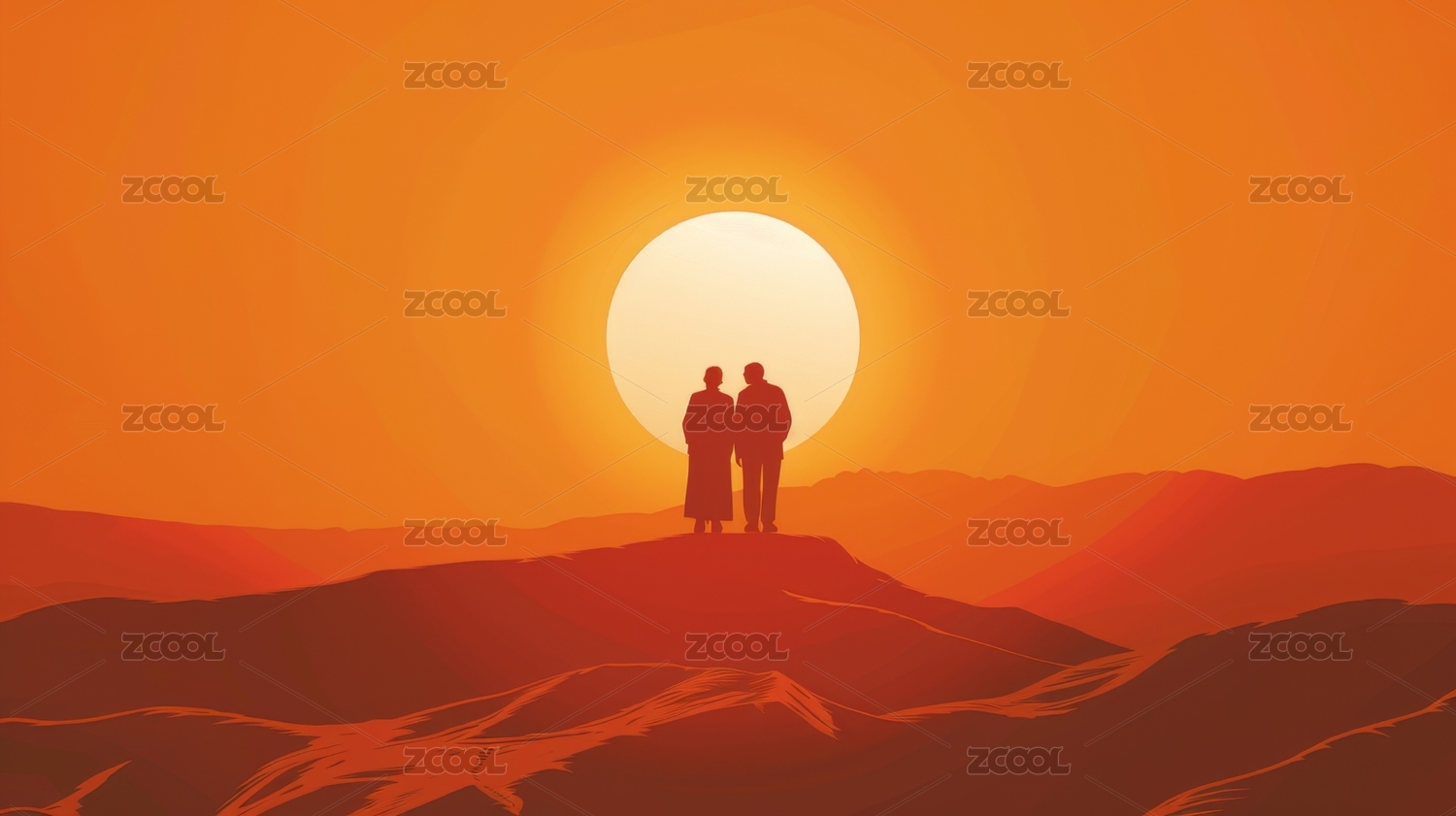 AIGC202406,背景,插图,插画,手绘,重阳节,剪影,太阳,爬山,登顶
