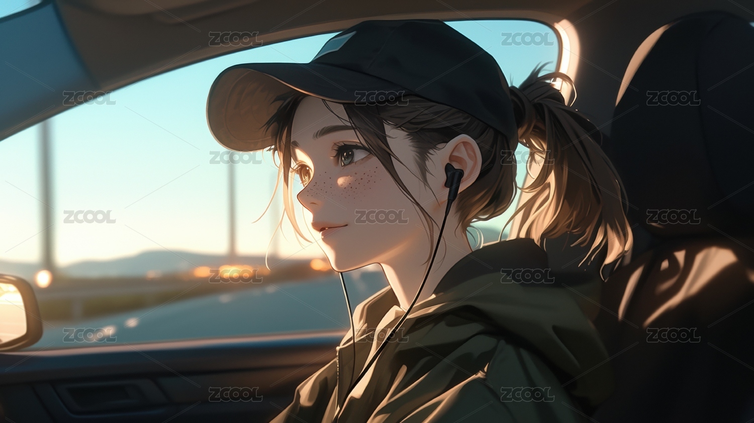 车内少女耳机聆听夕阳相伴