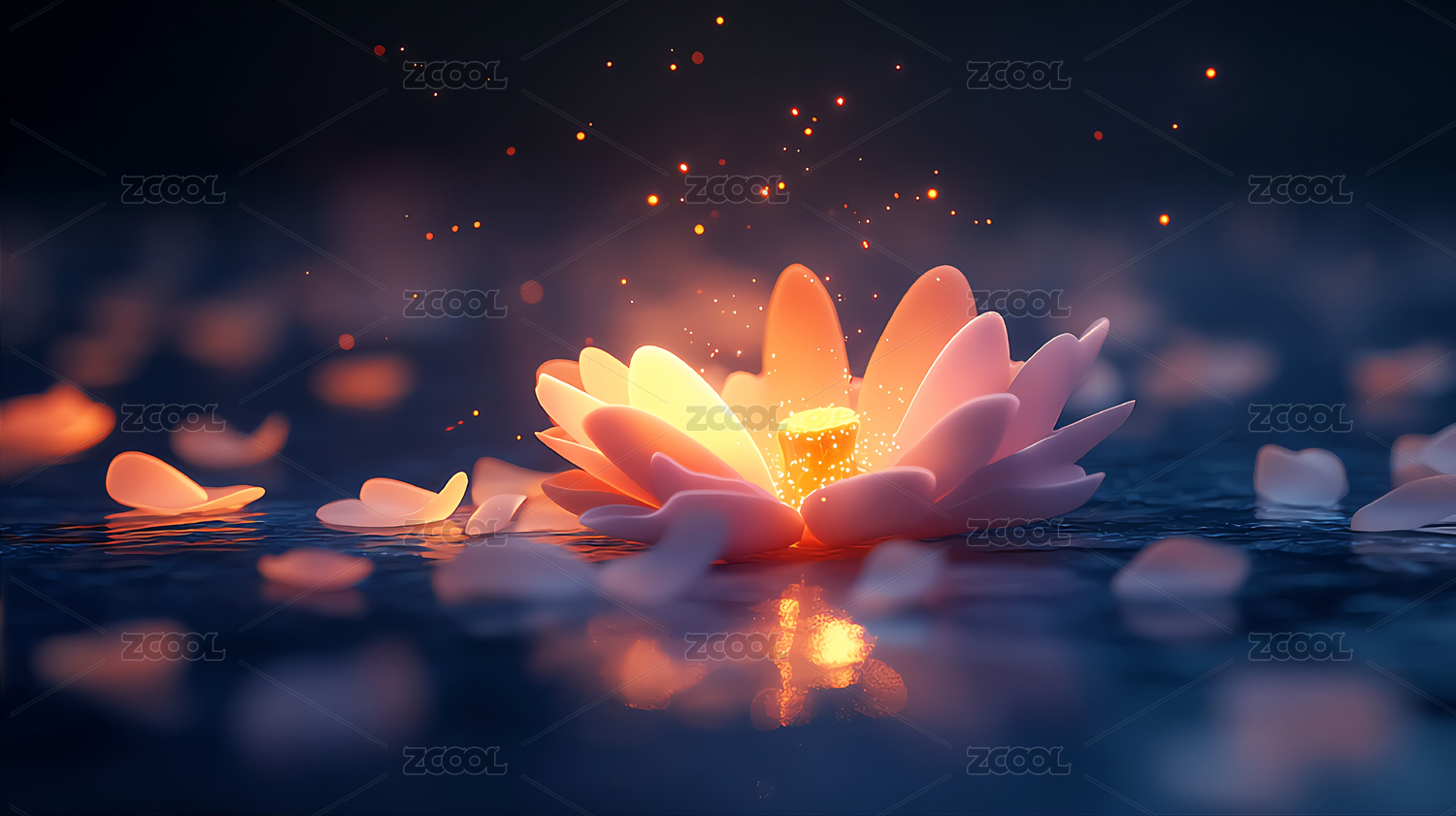 梦幻,唯美,夏天,荷花,盛开,绽放,夜晚,天空,水,倒影