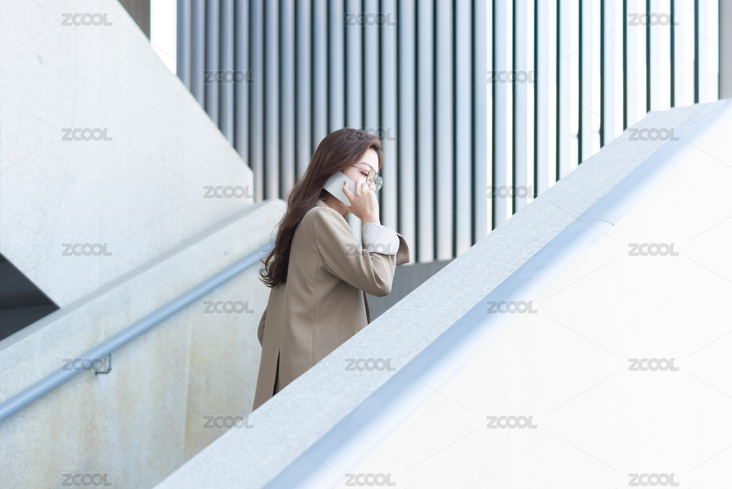 年轻女白领在楼梯上打电话