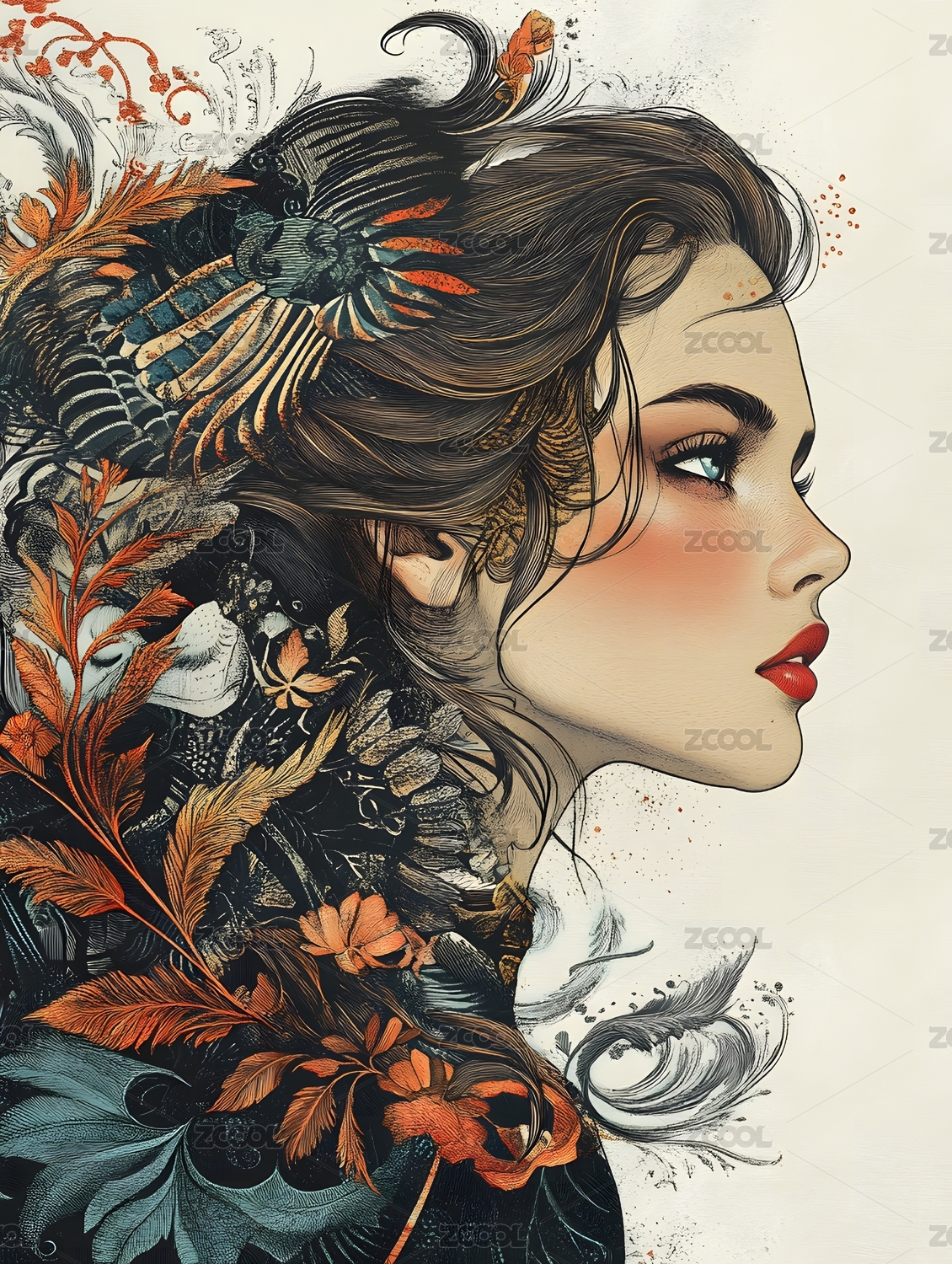 3D渲染绘画艺术美女人像鲜花背景的插画