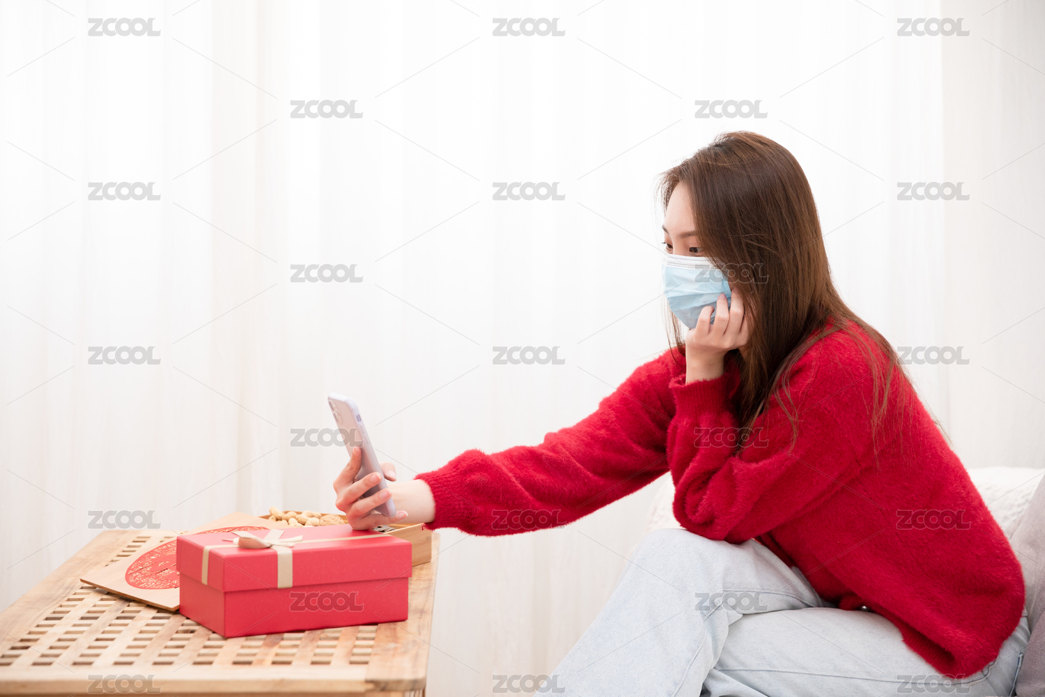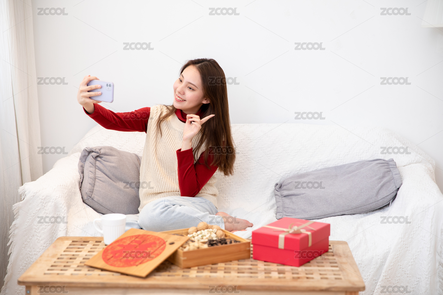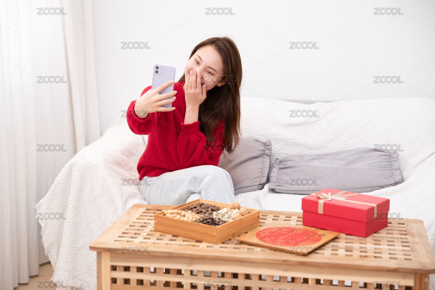 女性,一个人,坐着,沙发,冬天,温暖,美女,新年,过年,开心