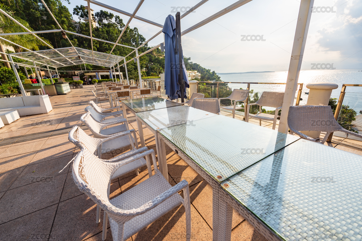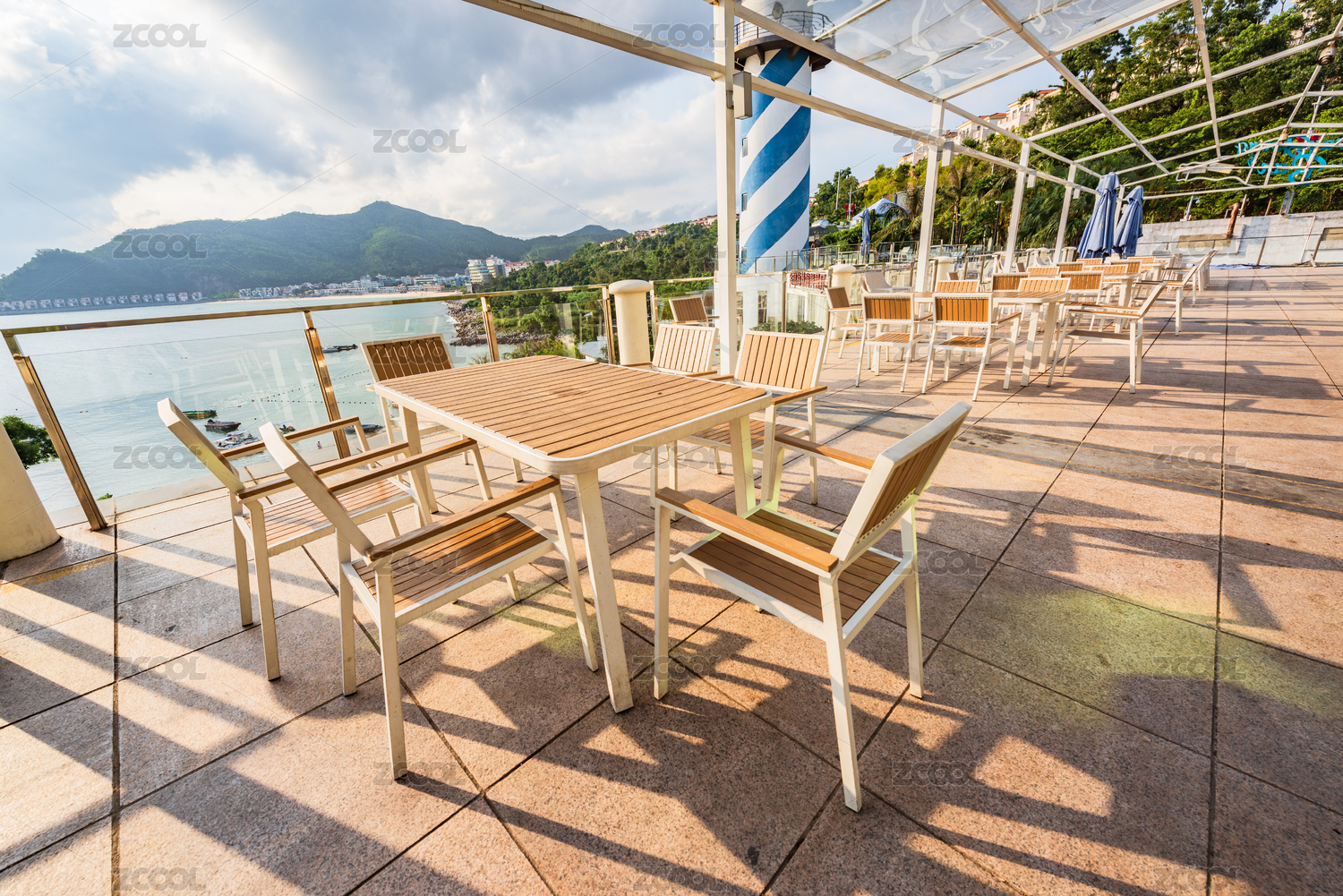 中国深圳南澳海贝湾午后阳光下的海景餐厅