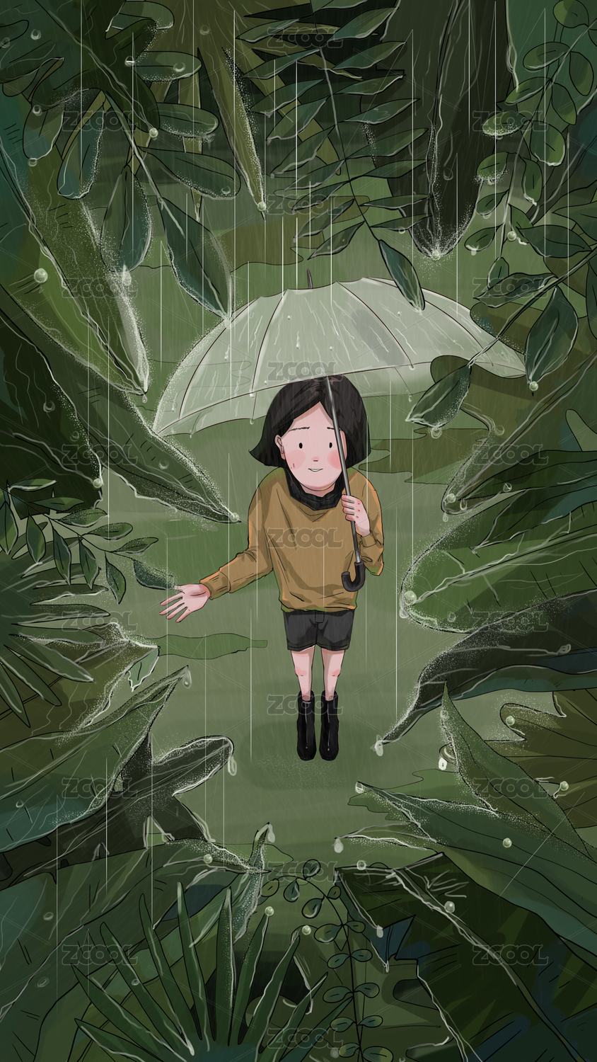 春天户外雨幕下绿色植物中坐在树叶上的女孩