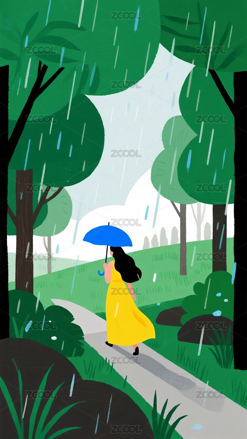 雨中撑伞行人林间小路行走