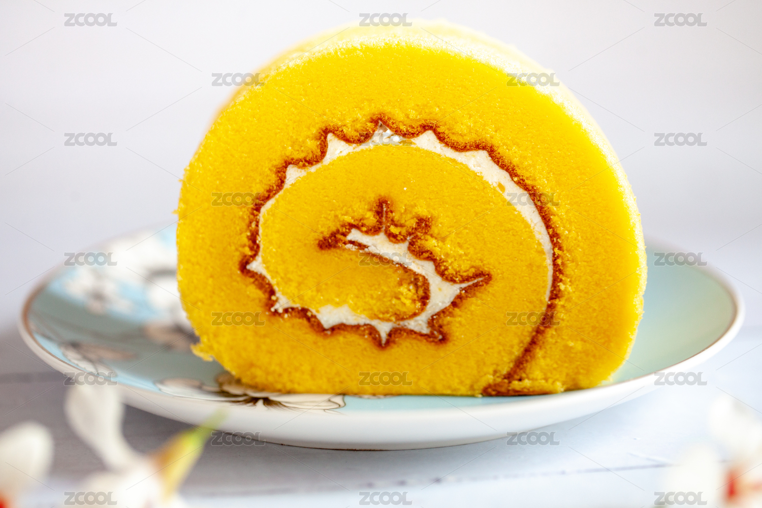 一盘鲜牛乳蛋糕卷摆放在桌面上特写