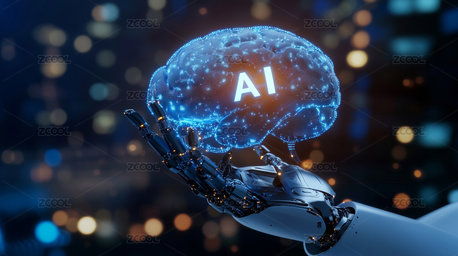 一个机器人手掌上悬浮AI字样