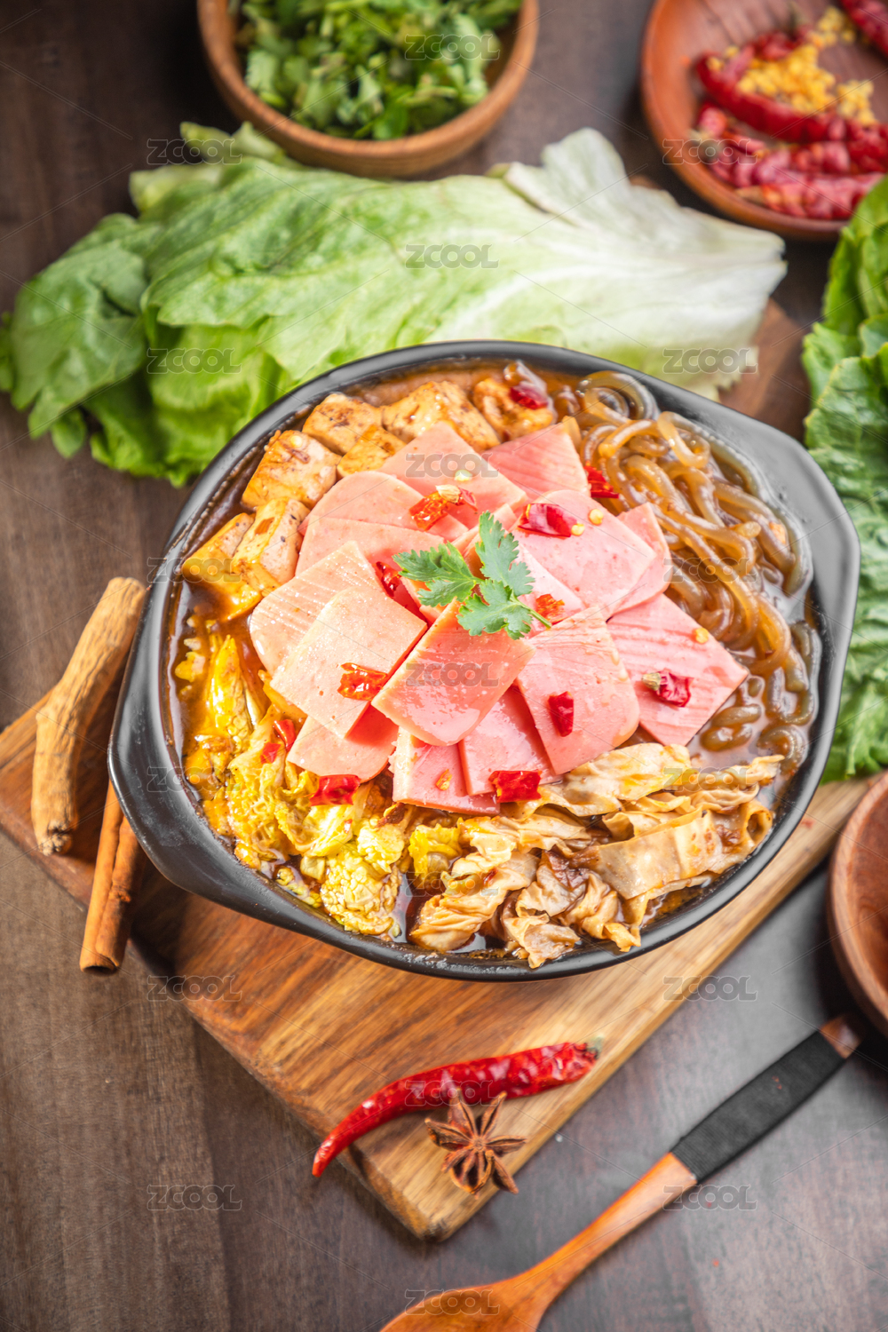 干辣椒,生菜叶,桂皮,大料,香菜,筷子,西红柿,棕色木纹板,菜单,黑砂锅