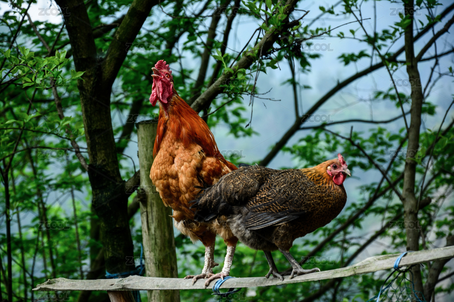 两只鸡站立于小院篱笆桩上