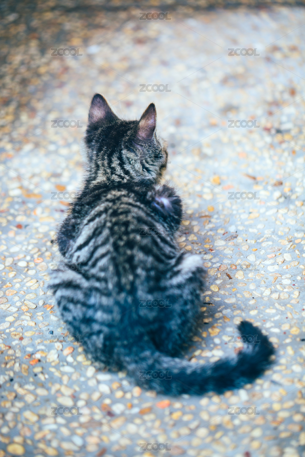 户外趴在路面上流浪的可爱小猫的背影特写镜头