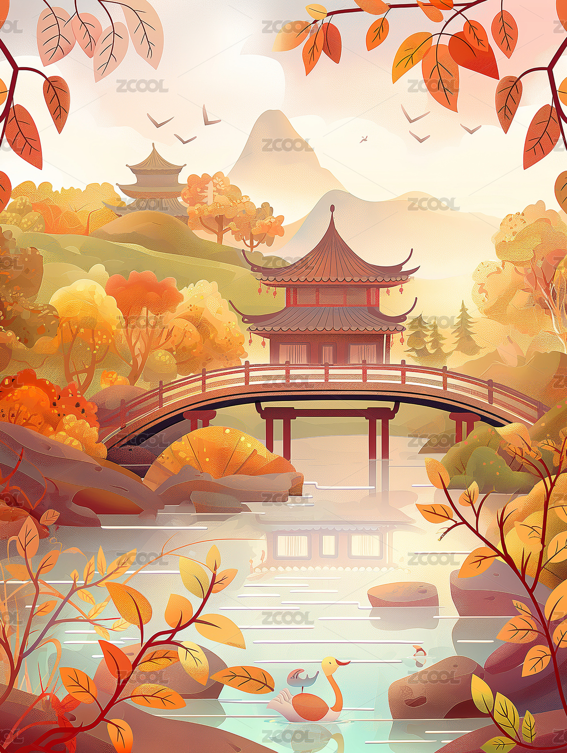 古桥秋景山水插画
