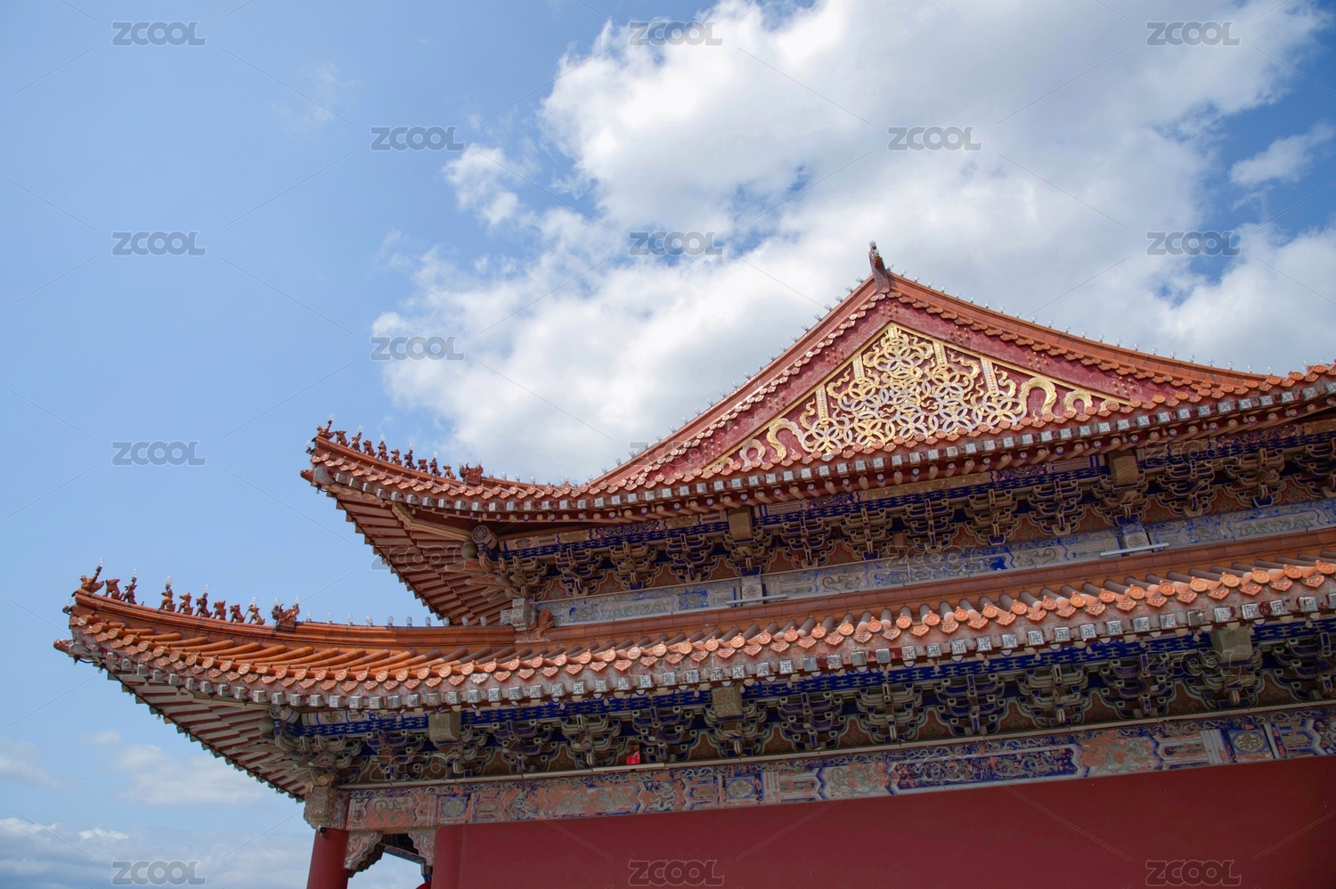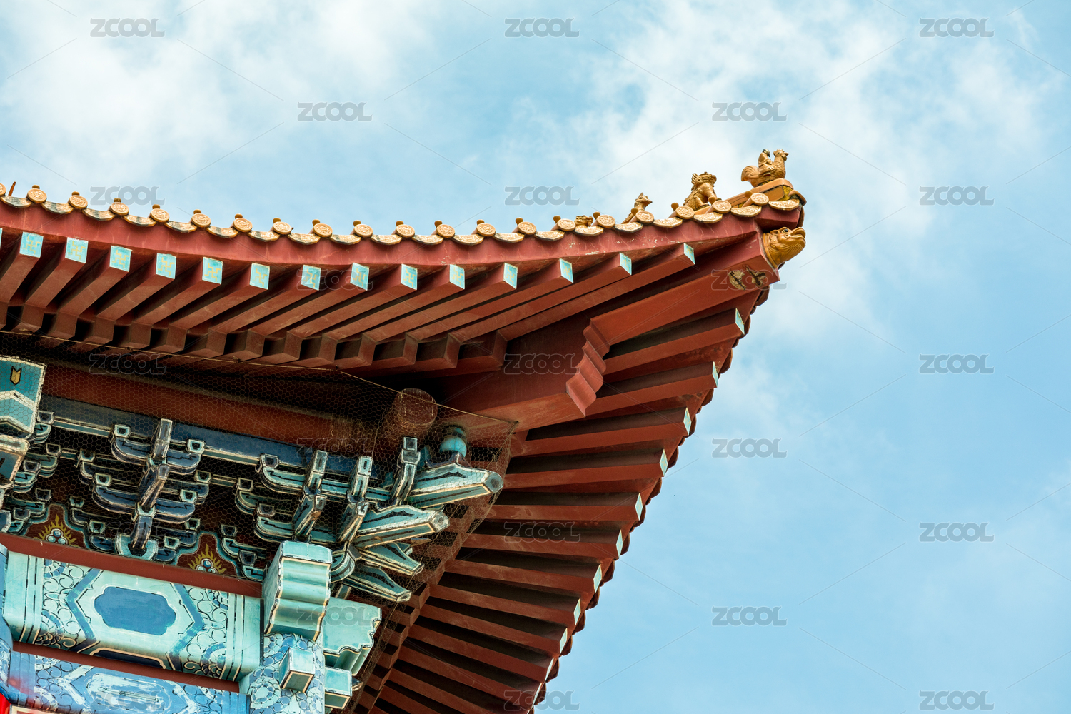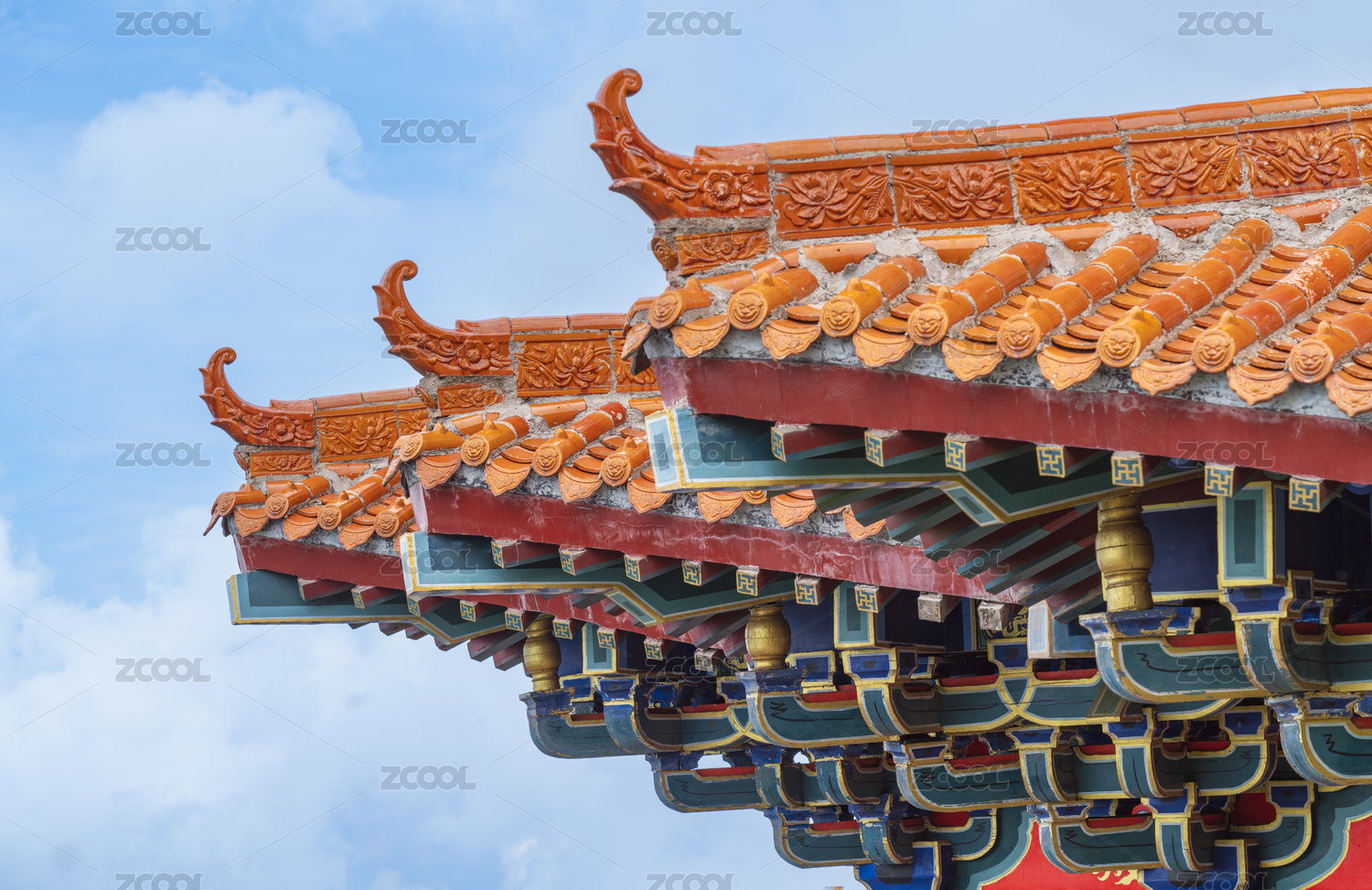 中国北京景山公园古建正面一角—琉璃瓦屋顶飞檐彩绘描金万字纹龙纹