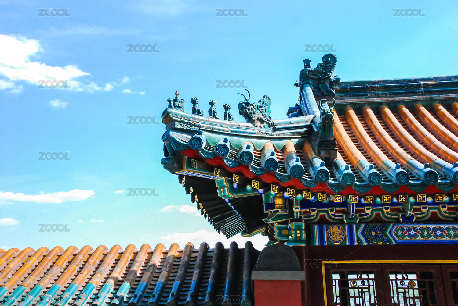 中国北京颐和园皇家古建一角——琉璃瓦瑞兽斗拱彩绘描金