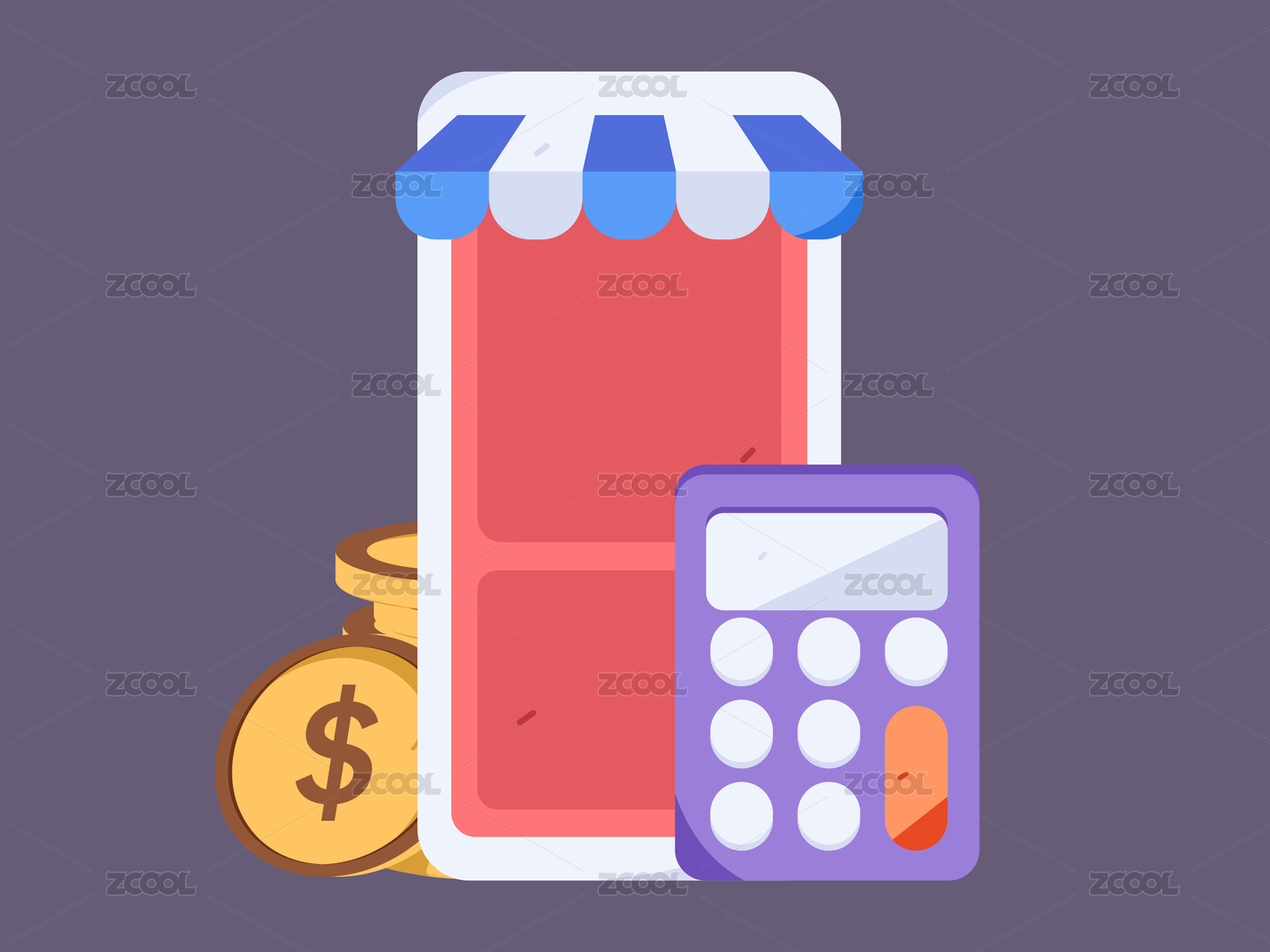手机上面有购物袋旁边有钱币矢量插画