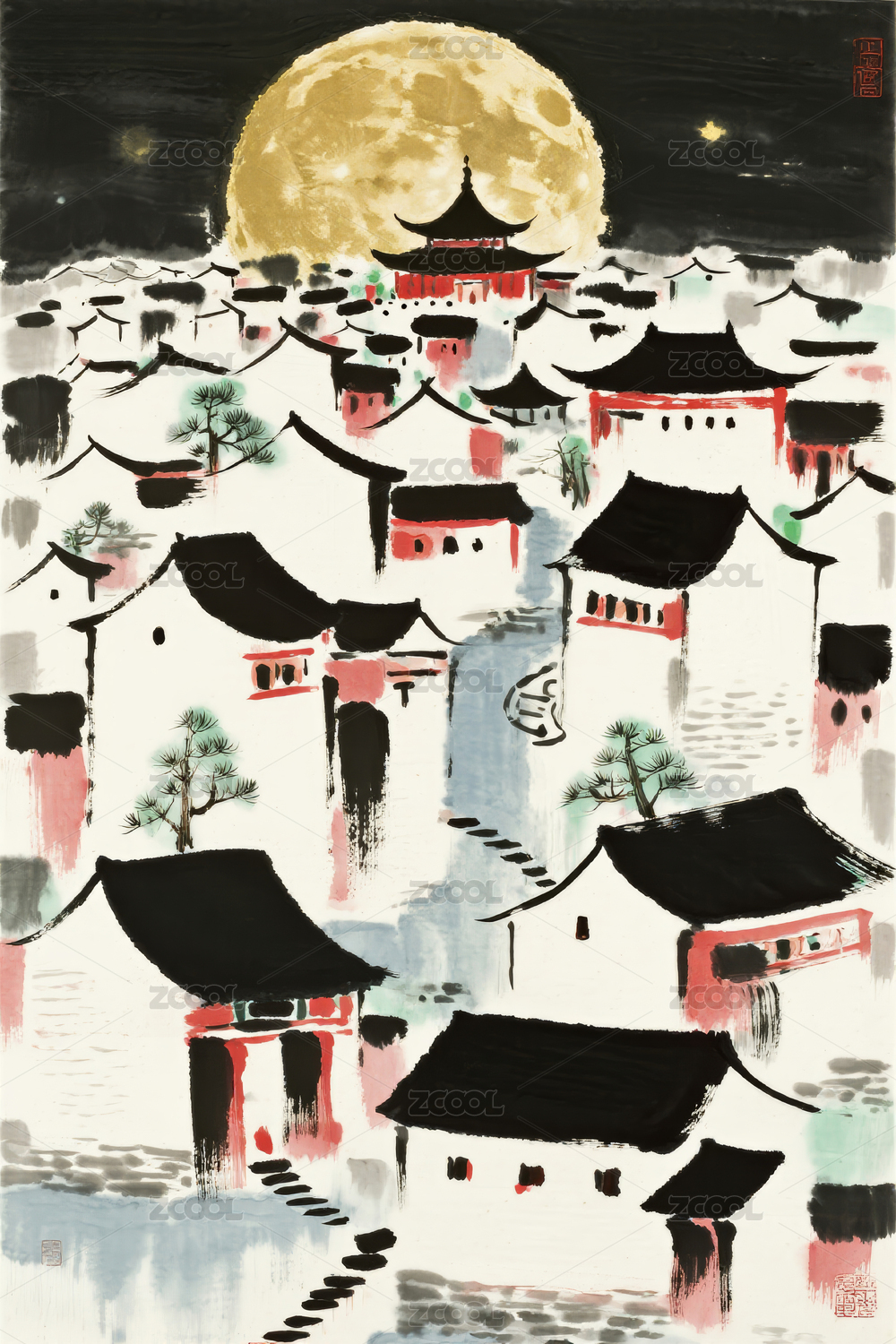 AIGCFG,中国风,水墨,插画,中式风格,古镇,建筑,人群
