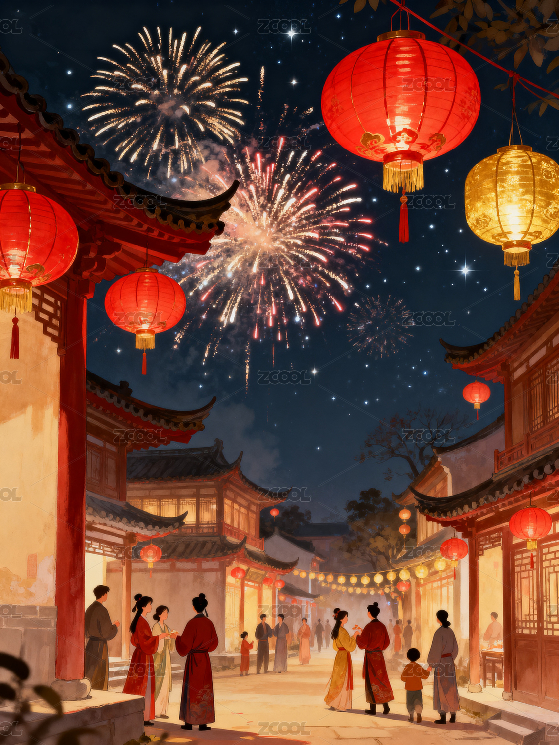 AIGCFG,中国风,水墨,插画,中式风格,古镇,建筑,人群