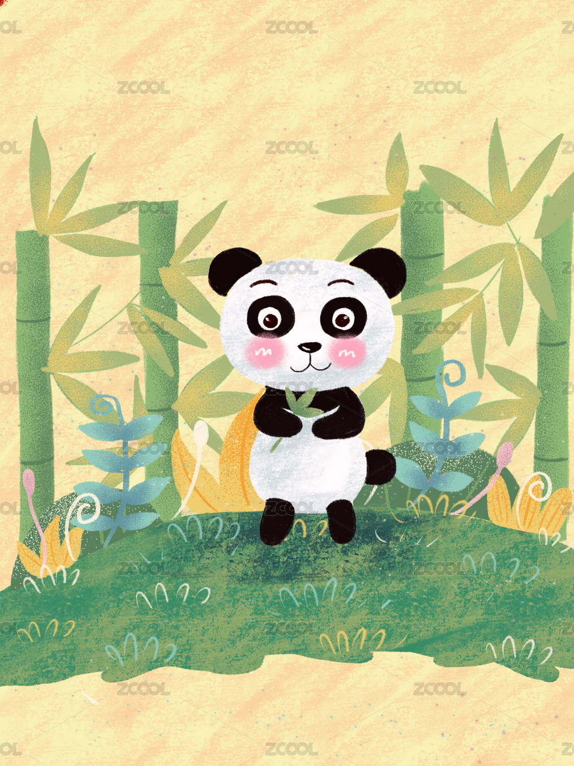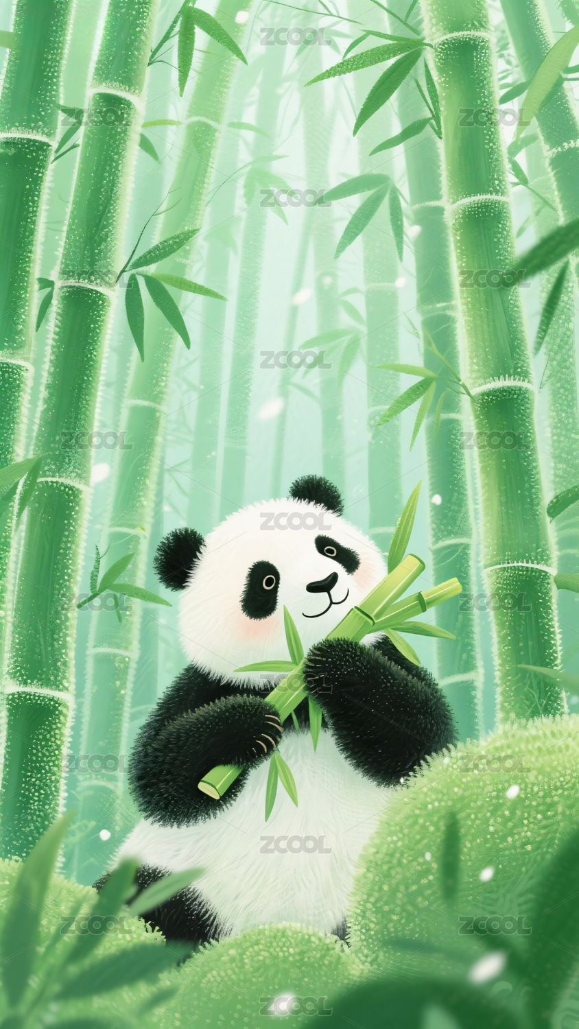 竹林中悠闲啃食的大熊猫插画
