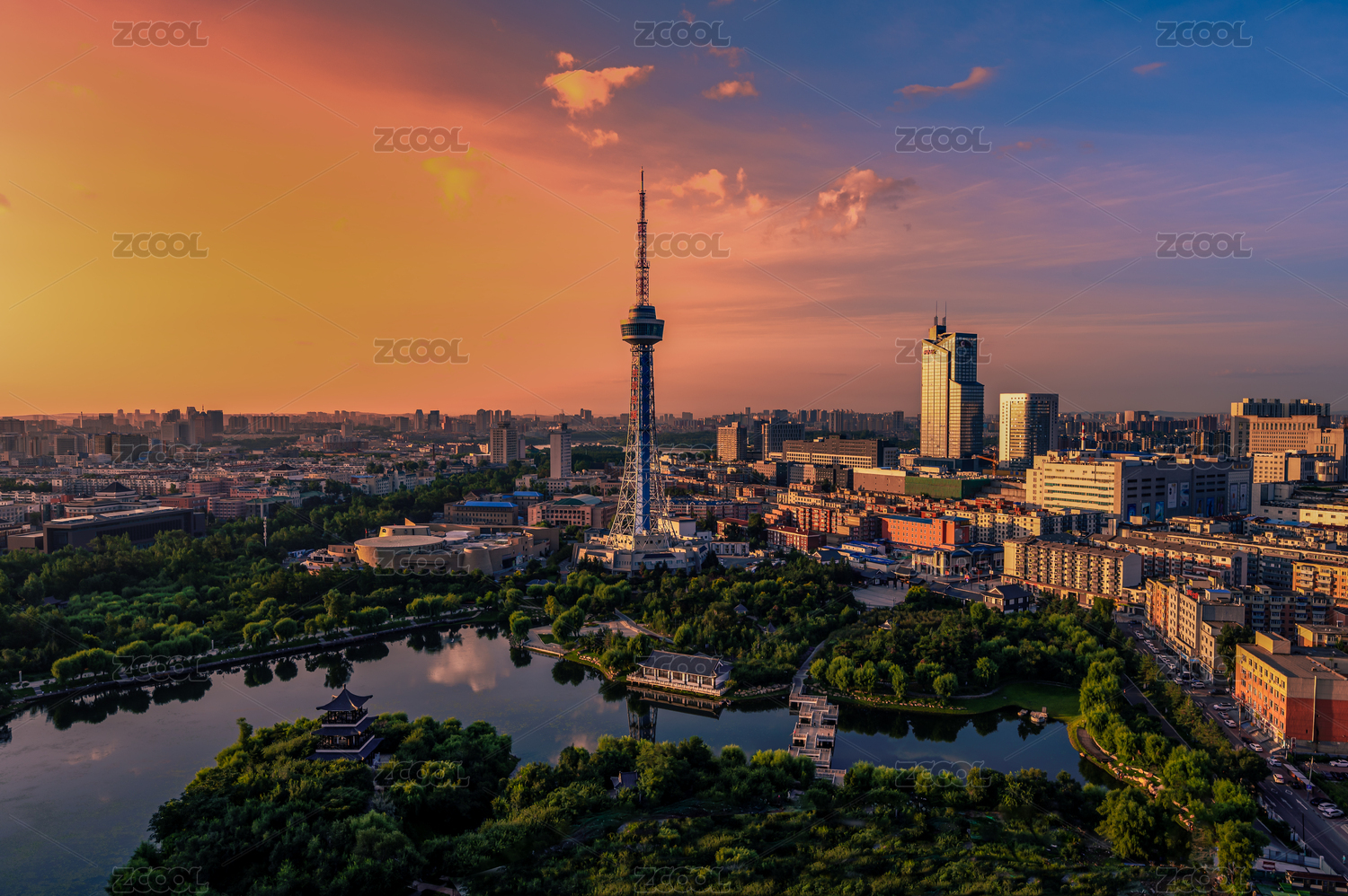 落日下的中国长春城区景观