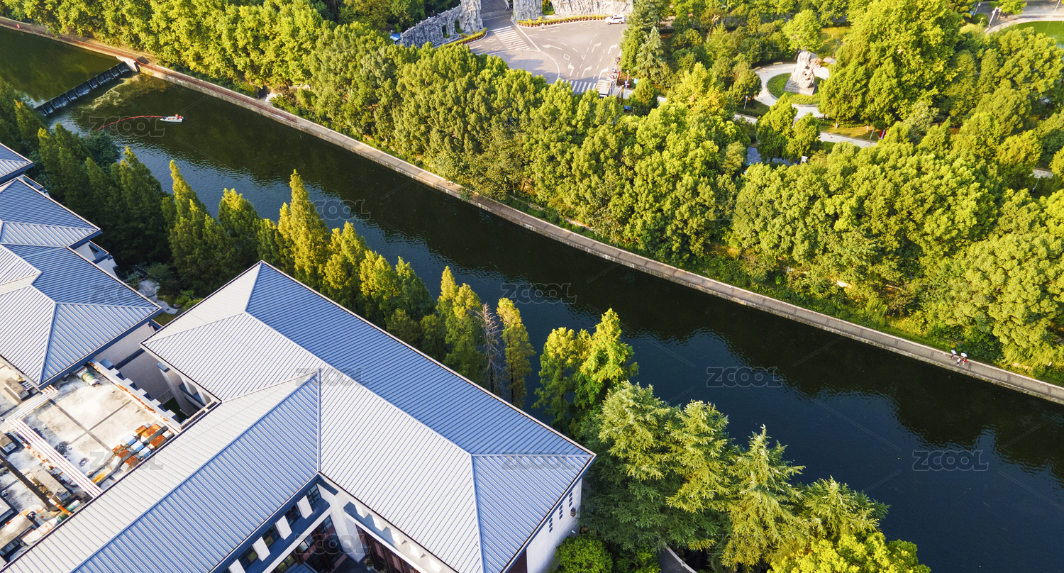 中国山东济南护城河局部航拍俯视图