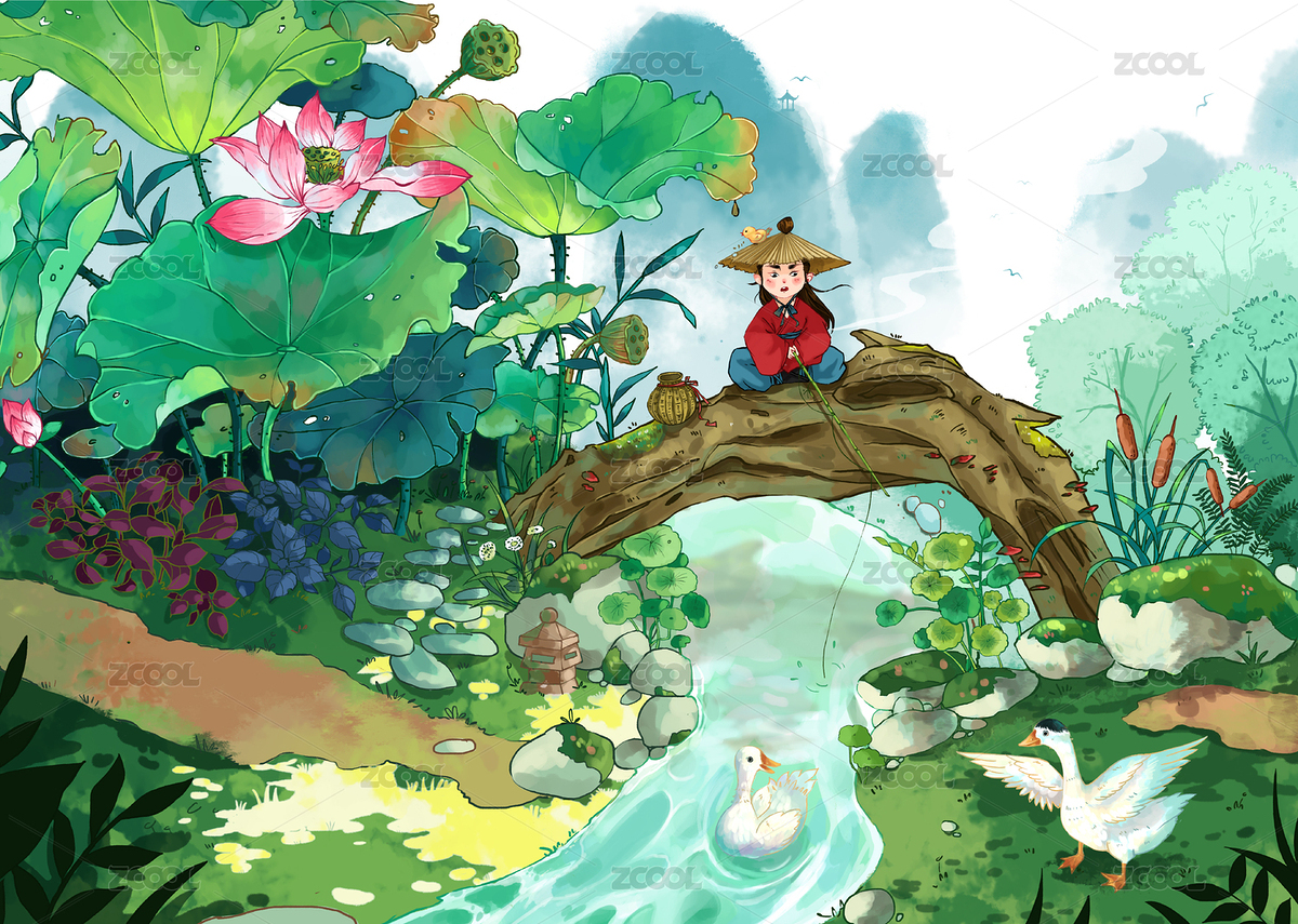 立夏,夏天,荷花,小溪,鸭子,小孩,芦苇,古风,绿色,蓝色