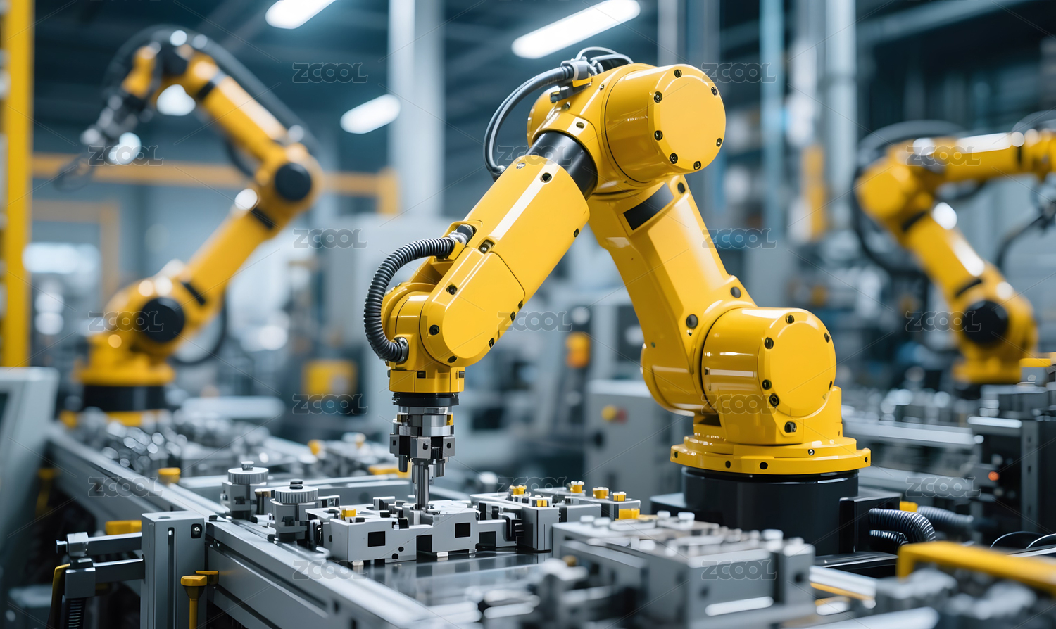 智能工厂中黄色机械臂精准作业场景