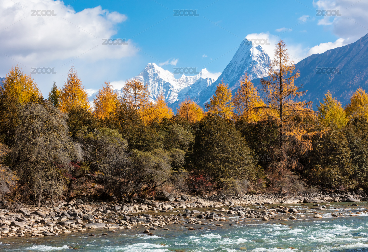 蓝天白云下的雪山森林和河流/高山冰雪融水