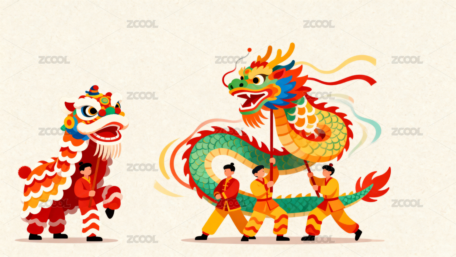 新春迎春舞龙舞狮国风插画