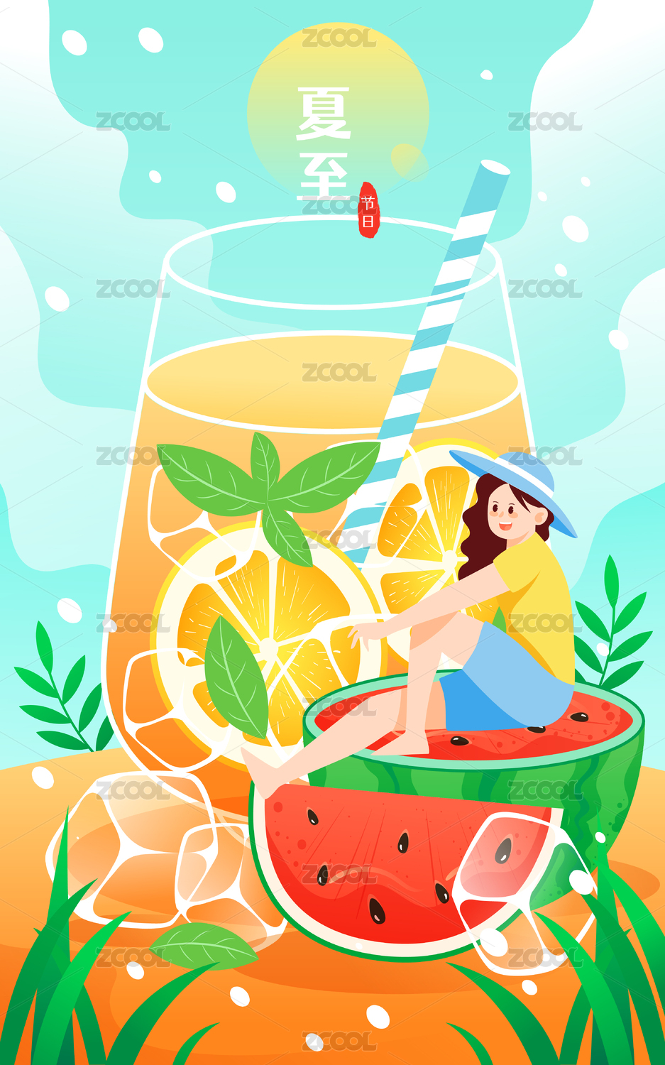 夏至,夏天,节气,二十四节气,海报,插画,西瓜,柠檬水,柳枝,柳树