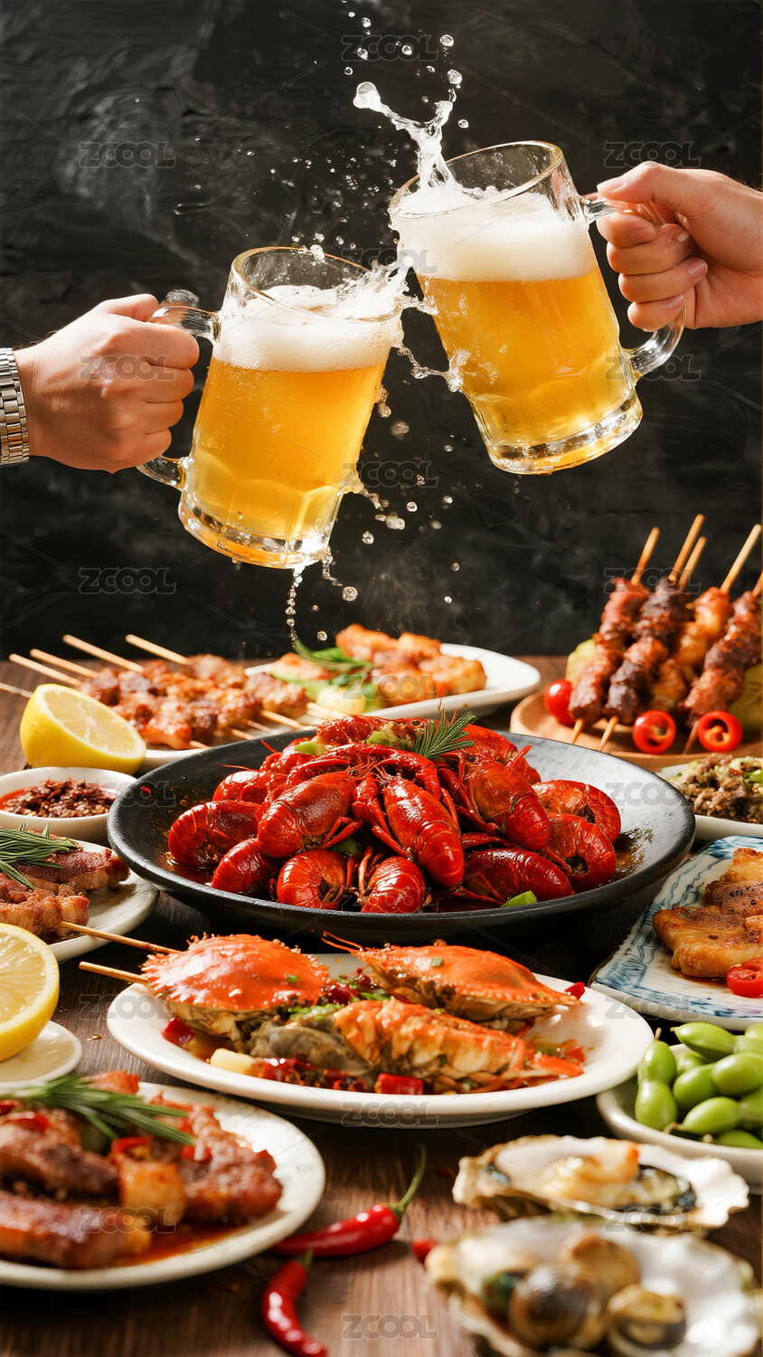 摆满各类美食的桌面上两只手举着啤酒杯碰杯