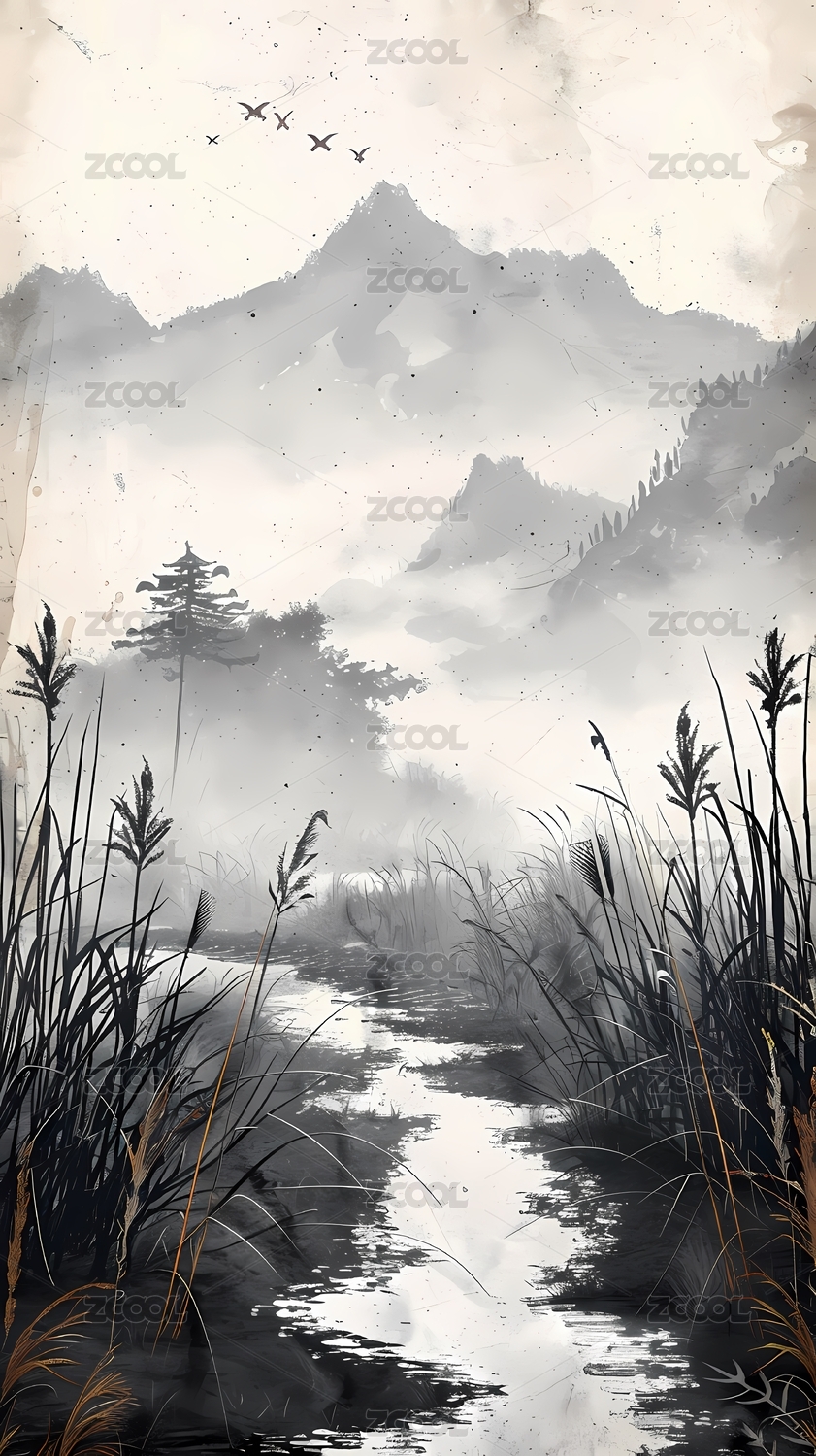 水墨山水草木抽象插画手机端海报背景装饰画