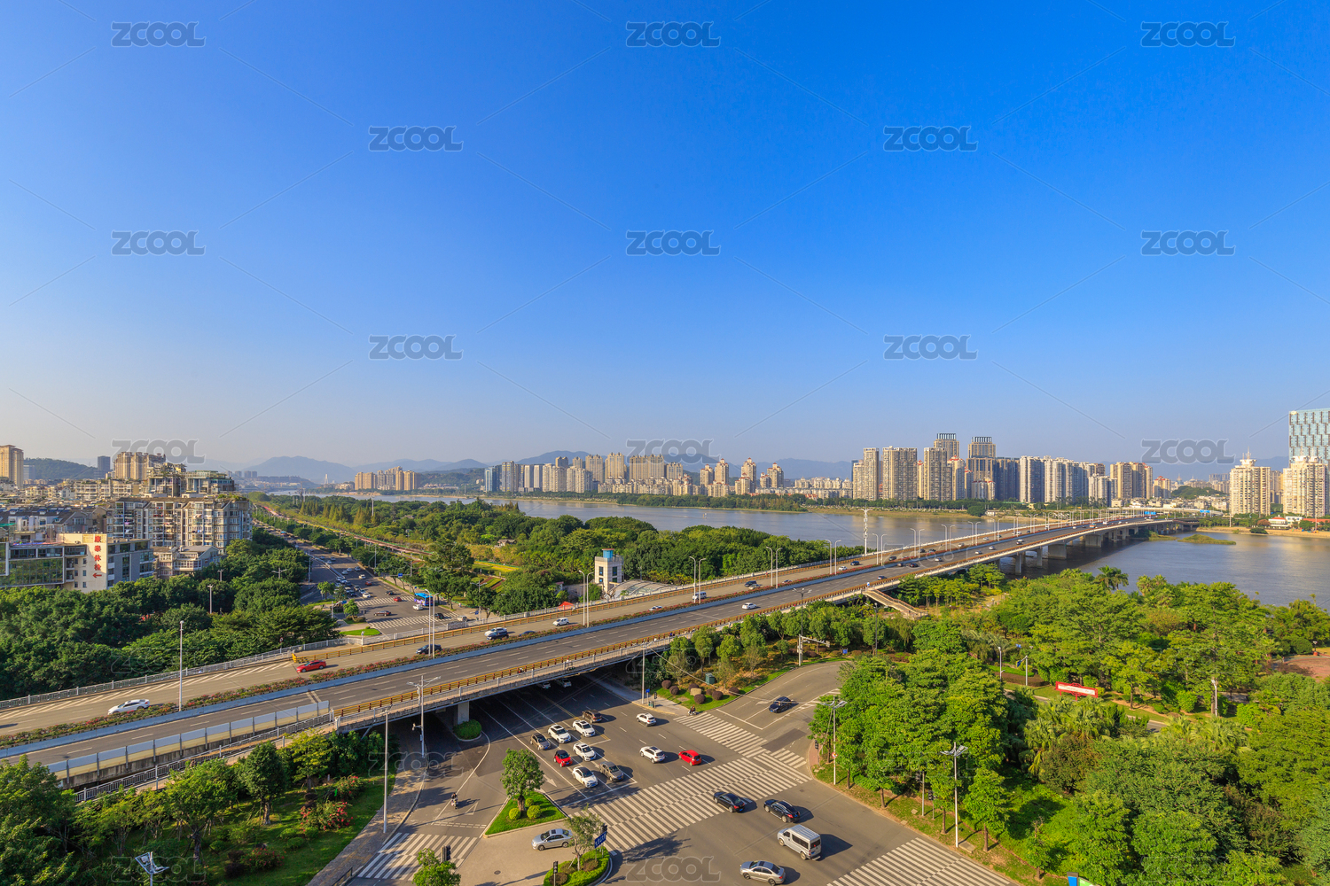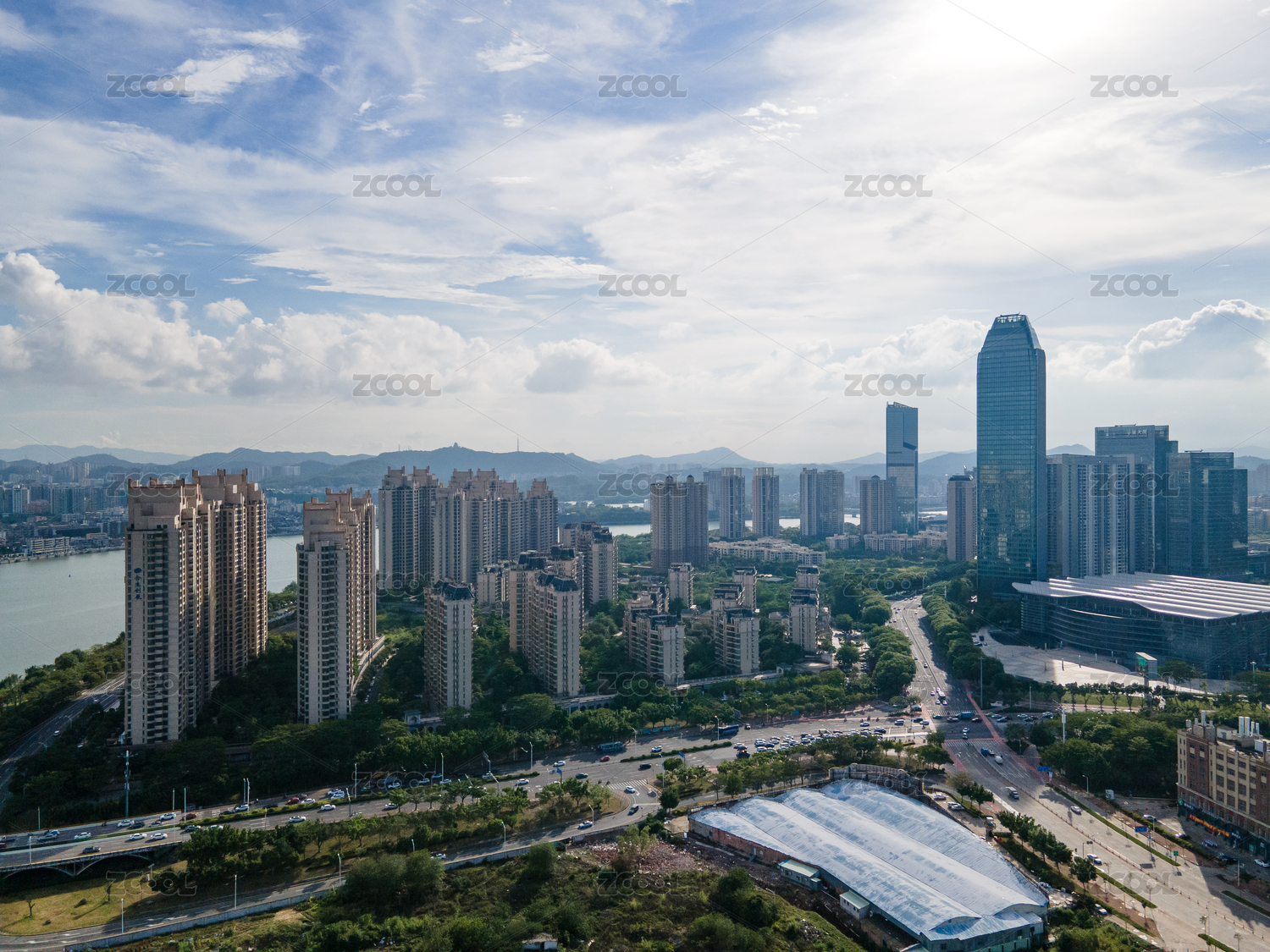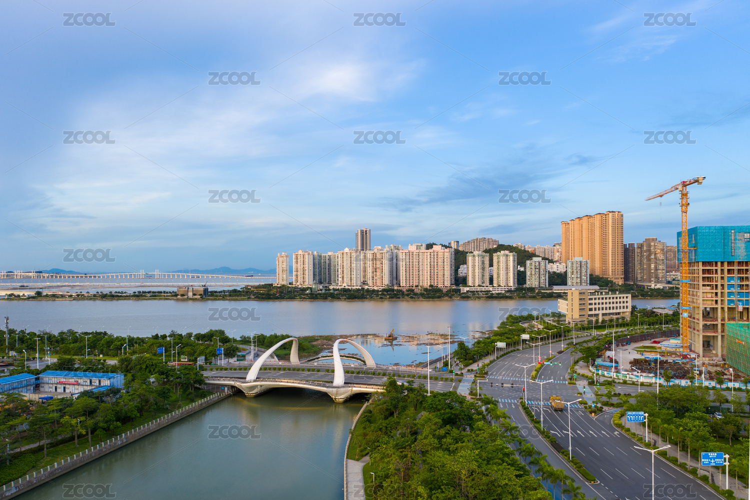 城市,滨海,城市景观,高楼大厦,建筑,河流,桥梁,阳光,白云,蓝天