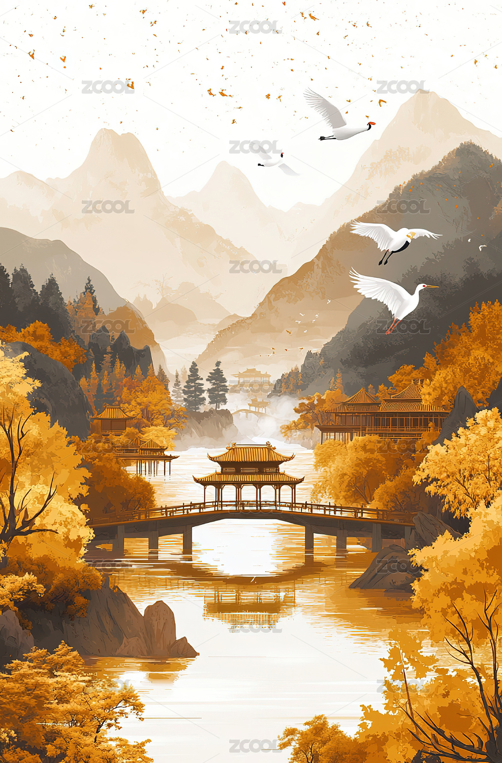 深秋远山瀑布中式风景插画素材海报
