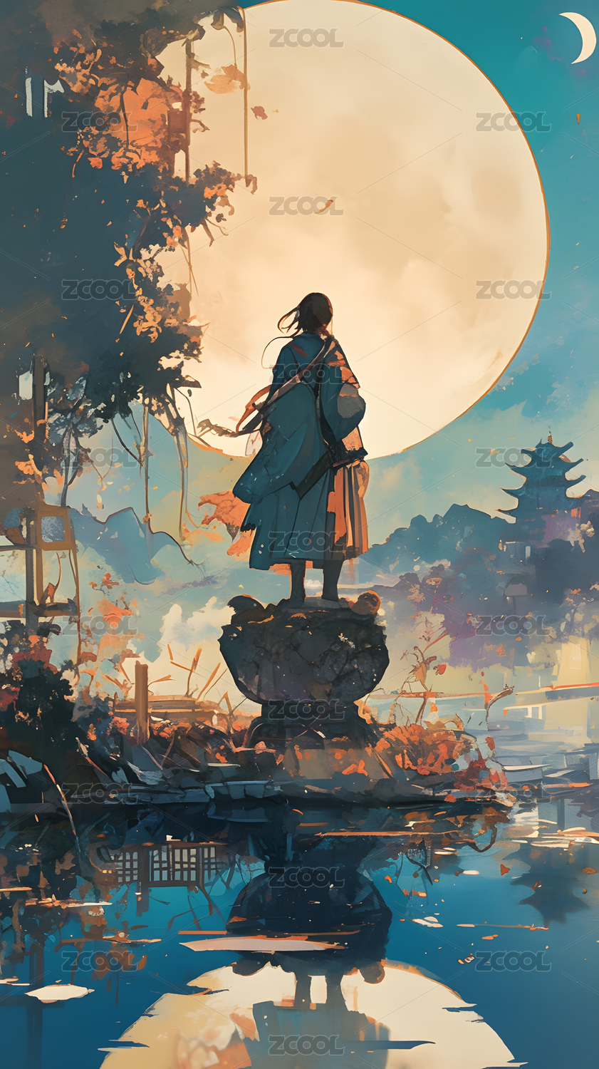 冥想,蓝色,艺术,剪影,月夜,空间,幽静,景色,树木,天空