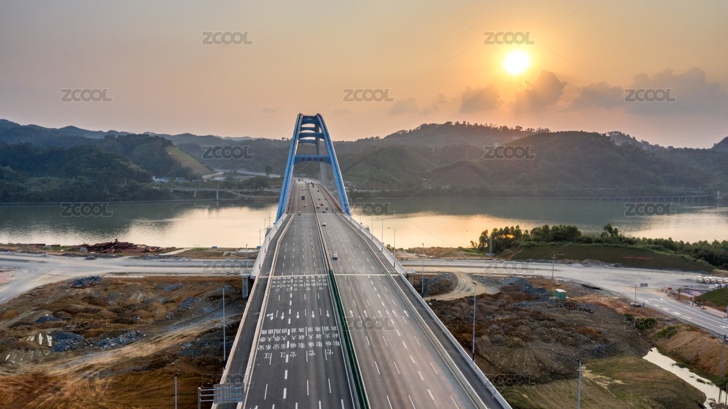 航拍春季傍晚中的广西柳州市官塘大桥和江面