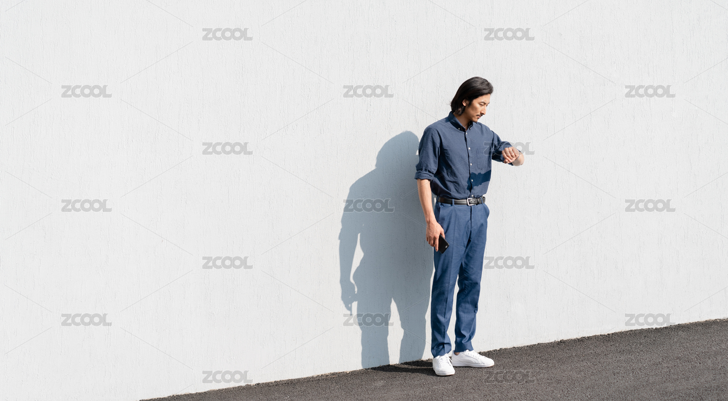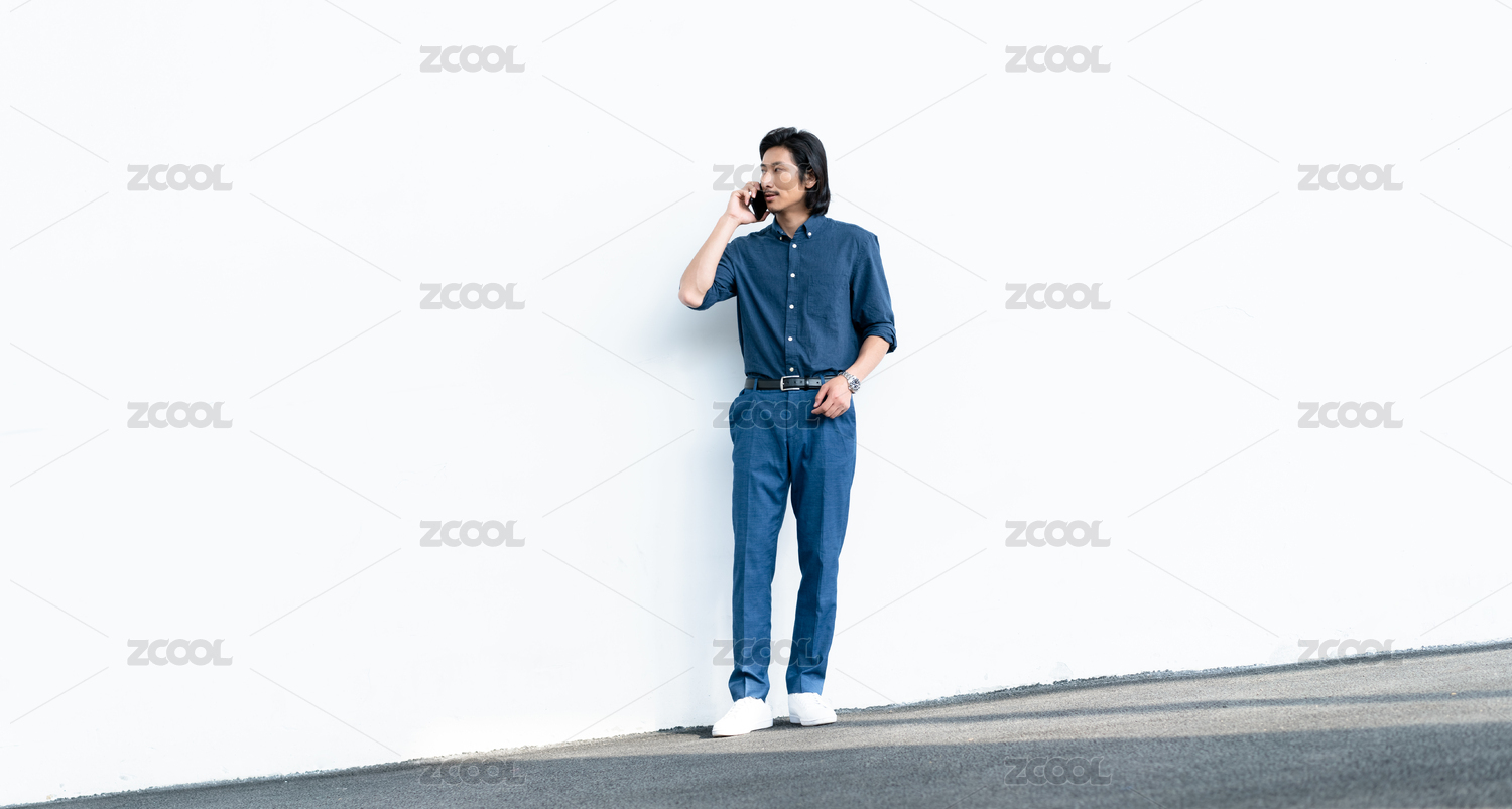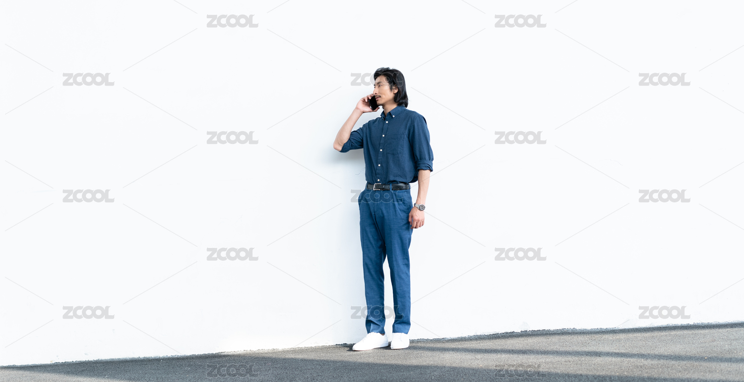 成熟的男士站在白墙边看手机