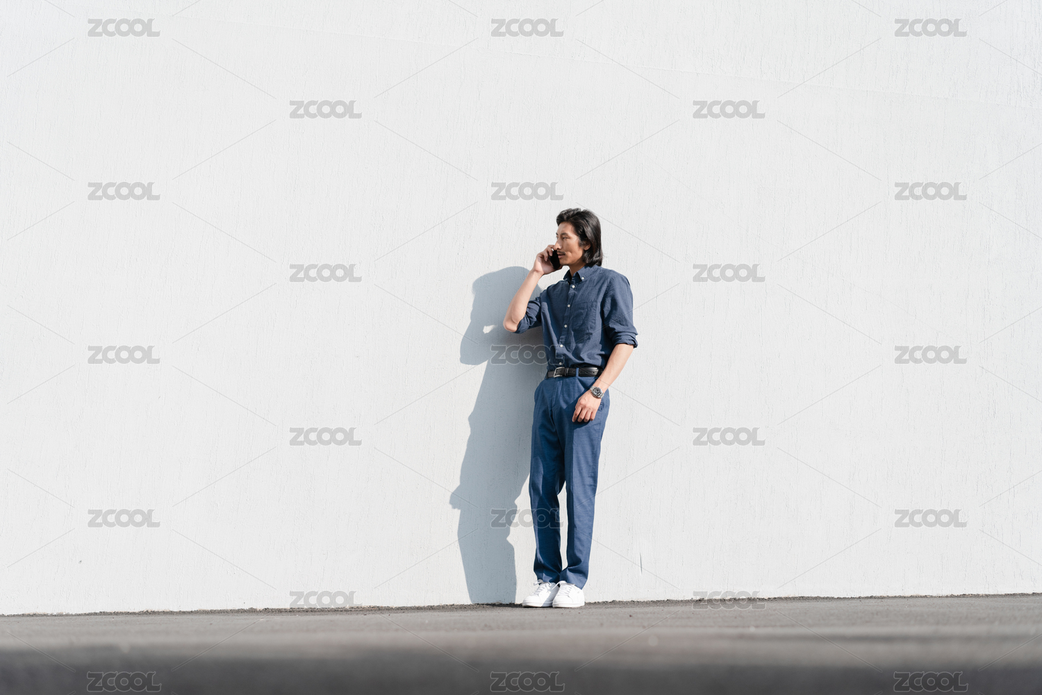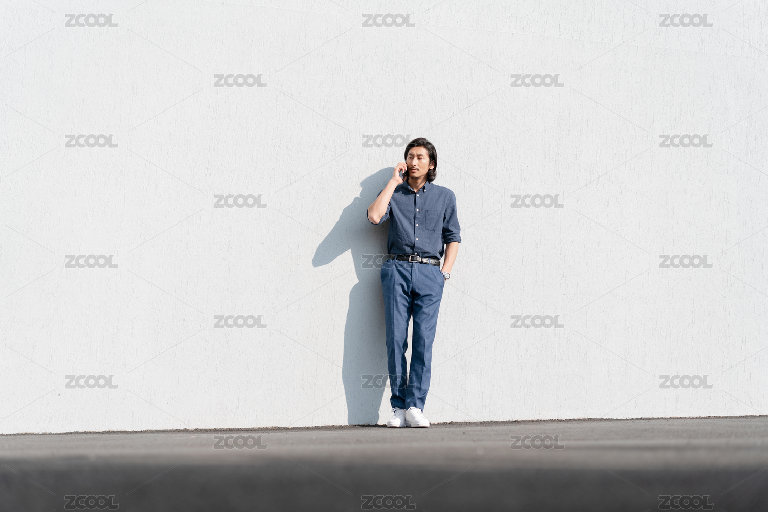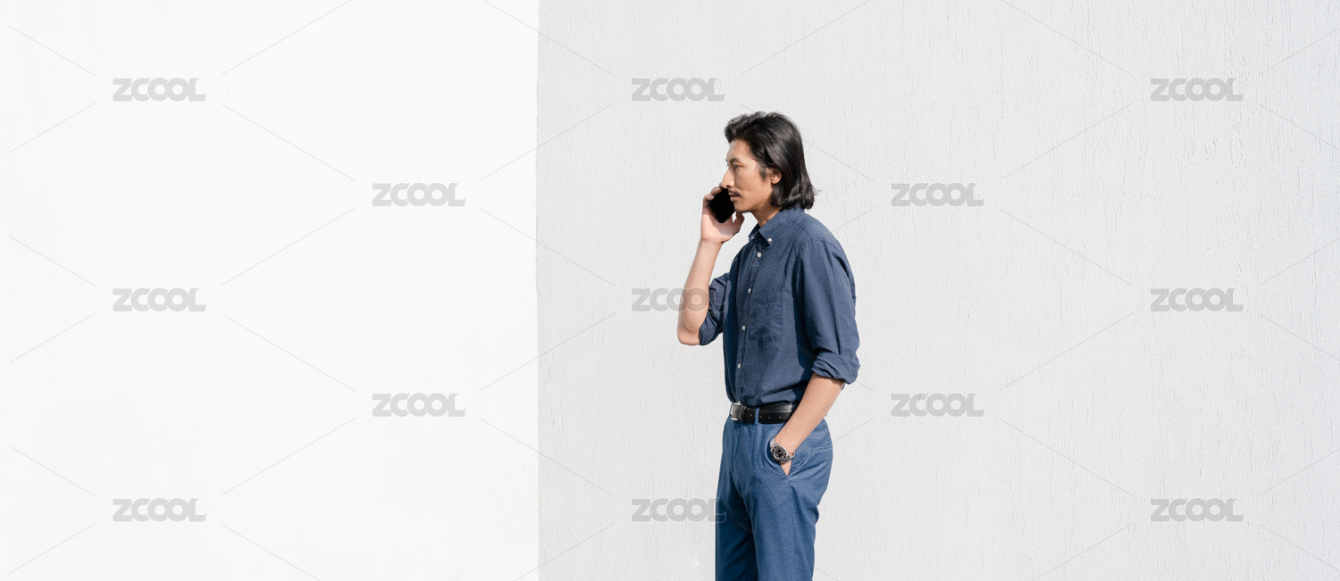 成熟的男士站在白墙前通话中