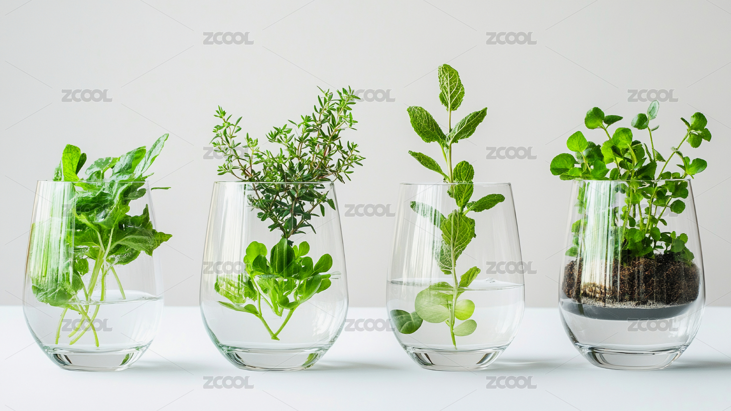 绿叶植物置于透明玻璃杯中