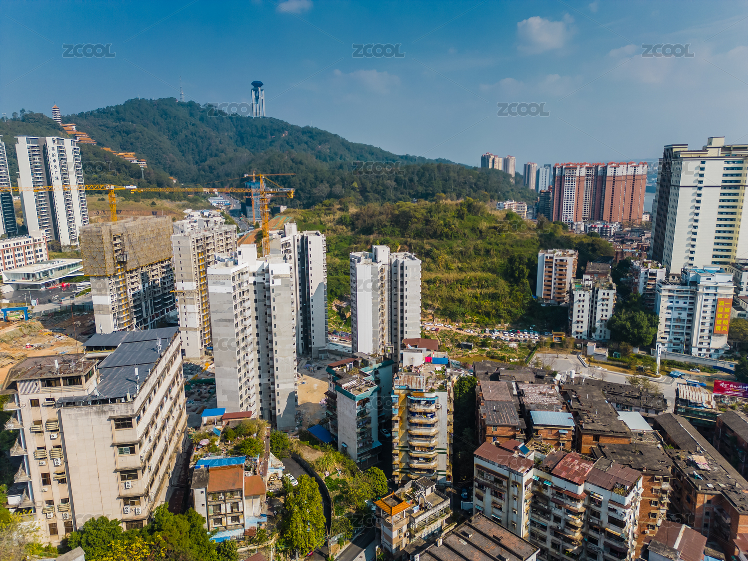中国福建省福州市蓝天白云日光下城区高楼建筑环境景观