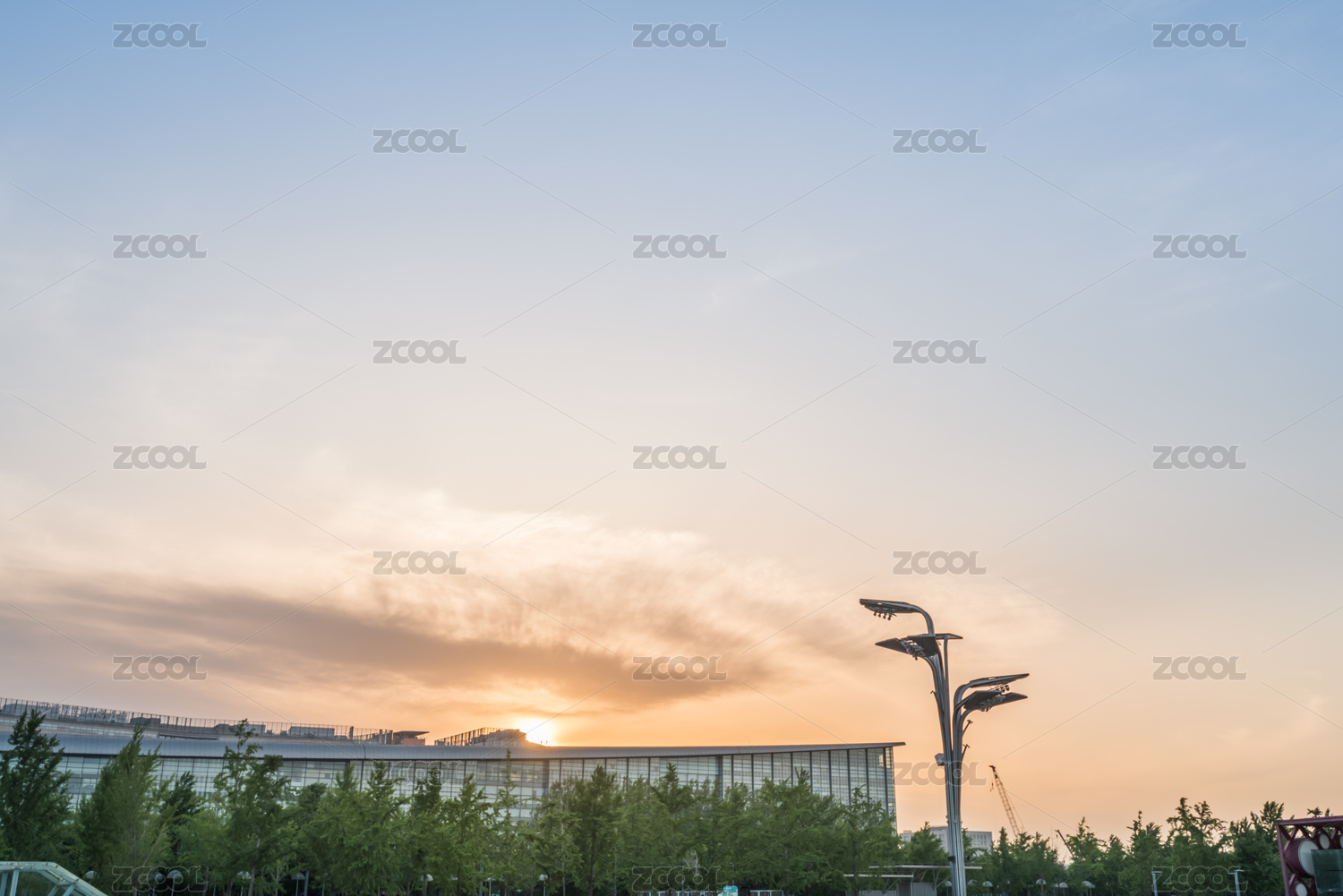 清晨中国南京江苏大剧院上空绚丽的朝霞